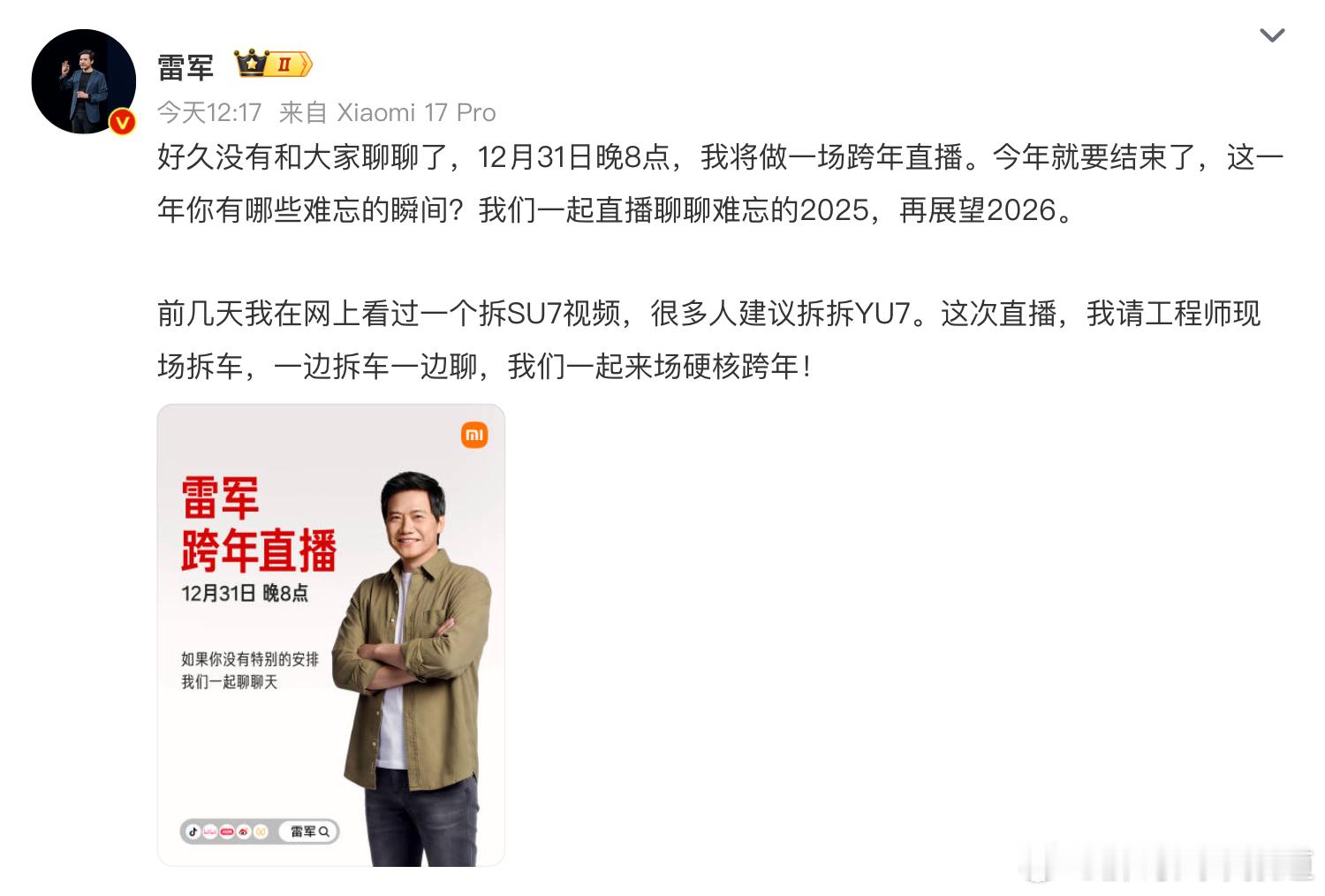 胖哥汽车频道雷军跨年直播拆车 明晚8点直播拆YU7,大家会看吗?为什么国产车销量越来越高了