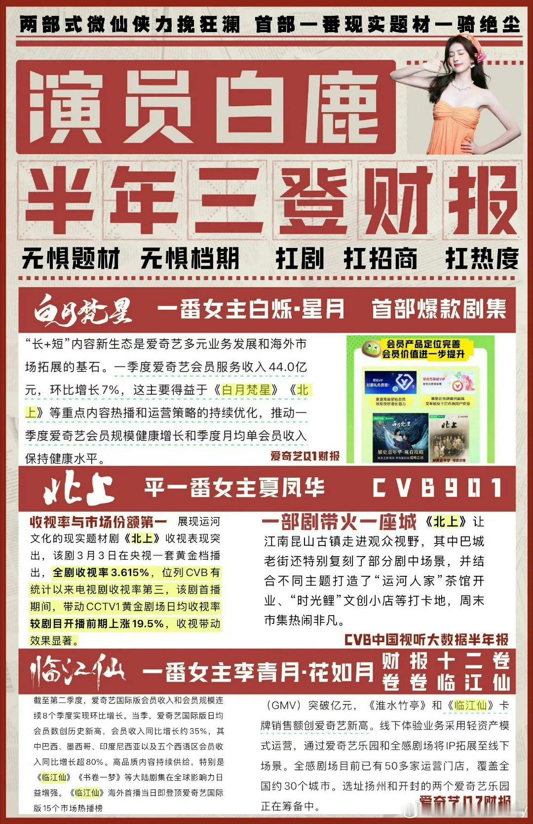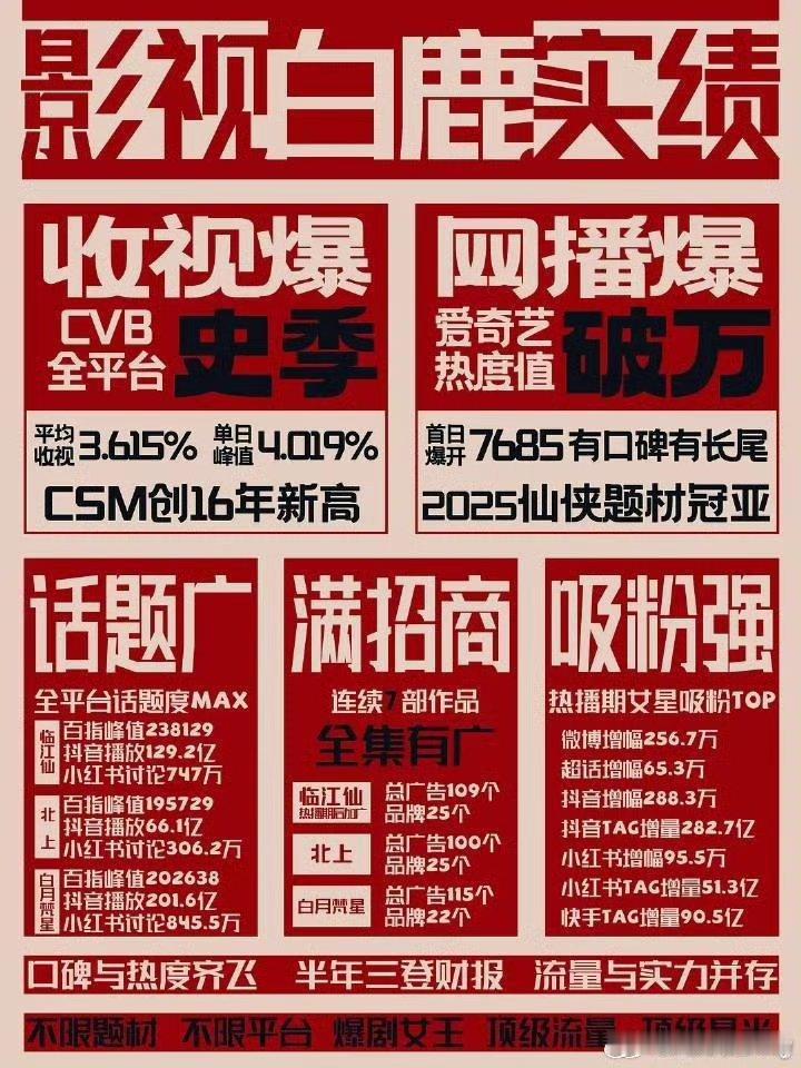 你们知道白鹿25年影视成绩有多🐮吗?2025年一共播了100多部剧,其中只有31部剧云合集均超过了2000w,云合集均超过3000的剧仅仅才15部,《临江仙》热播期云合集均破3000w+,《白月梵星》热播期双云集均破3000w+,《北上》热播期网播集均破2220w+,收视率年度第三(还是史亚),2025年那么艰难的播剧环境,你们鹿姐三部剧热播期云合集均全部超过2000w+,且在半年内三登财报!🐮