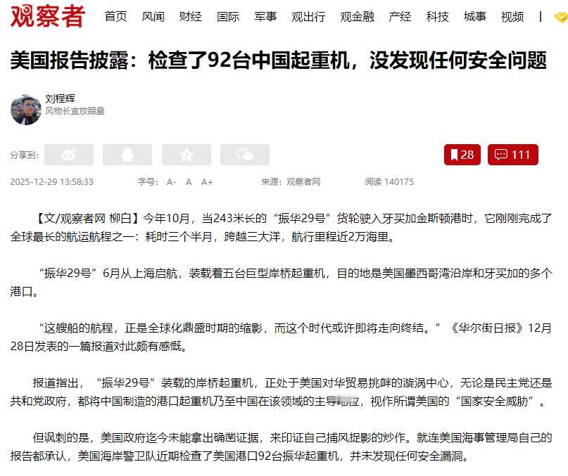 想找麻烦,但是“中国制造”太完美了,根本找不到!今年10月,243米长的“振华29号”货轮跑完三个半月的远洋航程,驶入牙买加港口。船上装的岸桥起重机,正被美国政客炒作成“国家安全威胁”。可《华尔街日报》12月28日的报道戳了他们的脸,美国海事管理局自己的报告显示,海岸警卫队查了美国港口92台振华起重机,啥安全漏洞都没找到。 说实话,看到这个结果我一点都不意外,反而觉得美国之前的炒作特别可笑。 他们根本不是真担心安全,就是看着咱们的起重机做得太好,心里发慌,想拿“安全”当借口拦着咱们发展。这事儿从他们的操作里就能看得明明白白。 先说说这次检查,美国海岸警卫队查得可严了,毕竟港口起重机关乎航运安全和人员性命,不是随便看看就完事的。 而且这92台起重机都分布在西雅图、迈阿密这些美国重要港口,都是航运关键节点。 自己人查自己重点盯着的设备,最后说“没问题”,这就很清楚了,所谓的“安全威胁”纯属瞎扯。 为啥美国非要盯着咱们的起重机?因为咱们的设备在全球都是顶尖的。就说振华重工,全球每10台岸边起重机里,7台以上都是他们造的,连续二十多年全球销量第一。 美国市场更不用说,80%以上的港口用的都是振华的设备,离了咱们的起重机,他们港口都没法正常转。这么核心的设备被中国企业主导,美国政客坐不住了,就想找借口打压。 最有意思的是个老例子,2013年奥巴马在迈阿密港口演讲,大吹“美国制造”,结果一阵风把他身后起重机上的美国国旗吹掉了,露出“振华ZPMC”的标志。 工作人员赶紧爬上去盖住,可还是被拍了下来,成了全世界的笑柄。这就说明,美国港口到处都是中国起重机,要是真有安全问题,他们能用到现在? 更打脸的是,美国一边喊威胁,一边还离不开咱们的起重机,照样下单采购。就像这次“振华29号”运的起重机,就有要送到美国墨西哥湾港口的。 之前美国政府还想对中国起重机加100%的关税,结果美国港务局协会直接反对,说美国本土几十年前就不造这种起重机了,重新建厂要十年,加关税只会让港口成本暴涨,最后还是老百姓买单。 说到底,美国海事管理局这92台起重机零安全漏洞的结果,直接戳破了他们的谎言。咱们的起重机能风靡全球,靠的就是过硬的质量和技术。 美国政客与其花心思编瞎话打压咱们,不如想想怎么解决自己的产能问题。中国制造业靠实力说话,这种无端的抹黑和打压,根本挡不住咱们的发展。