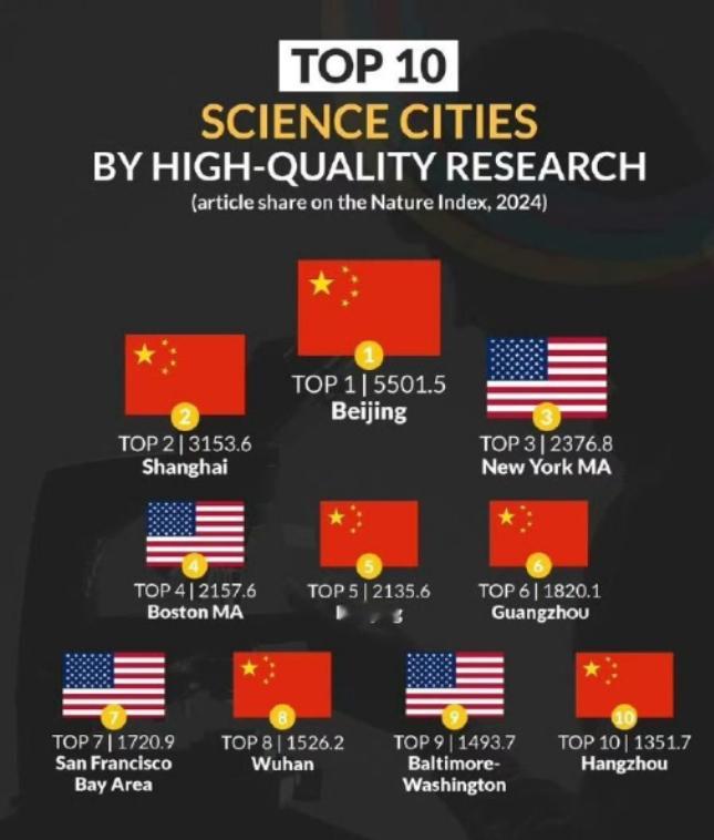 全球十大科研城市,被中美瓜分完毕,东京和伦敦根本排不上名次!最近,《自然》杂志旗下“自然指数”发布了一项关于全球科研产出的城市排名。结果令人意外又不意外:全球科研实力最强的十座城市,全部集中在美国和中国——中国占了六席,美国占四席;更值得注意的是,前两名居然都是中国城市。这个榜单是基于2023年在82种高质量自然科学期刊上发表的论文数据,统计各城市所属机构的科研产出贡献。换句话说,这是用实实在在的论文数量和质量说话,而不是像某些大学排名那样掺杂声誉、师生比甚至国际化程度等模糊指标。曾经长期被视为全球科研重镇的东京、伦敦、巴黎、苏黎世、慕尼黑等传统科技强市,这次竟然无一上榜。美国虽然整体科研实力依然强劲,但其科研资源高度集中在几个创新走廊:东海岸的波士顿—纽约—巴尔的摩“学术三角”,西海岸的旧金山湾区(包括斯坦福、伯克利、硅谷)。这些区域吸纳了全美最顶尖的人才和资本,但也导致其他城市难以突破。相比之下,中国的科研布局更强调“多点开花”,通过国家实验室、大科学装置和区域创新中心的建设,把科研能力下沉到二线城市。再看东京和伦敦为何掉队。日本近年来科研经费增长停滞,对基础研究的支持力度减弱,加上人口老龄化导致青年科研人员比例下降,整体产出增速放缓。而英国尽管拥有牛津、剑桥等顶尖学府,但脱欧之后科研合作受限,欧盟科研资金流失,加之政府研发投入长期低于OECD平均水平,使得伦敦虽有声望,却难在实际产出上与中美头部城市抗衡。这一格局带来的影响是深远的。一方面,全球科研重心正在从欧美单极向中美双极转移,国际科技合作的“朋友圈”也在重构;另一方面,科研城市的崛起直接带动了本地产业升级——比如合肥的量子计算、武汉的芯片制造、波士顿的生物医药,都已形成“科研—产业—资本”的闭环生态。