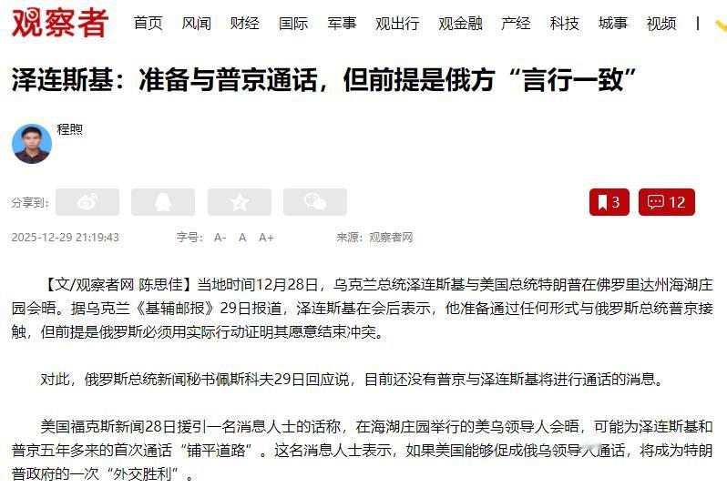泽连斯基真的不觉得自己像“小丑”吗?当地时间12月28号,泽连斯基跑去美国佛罗里达,跟特朗普在海湖庄园见了面。转天乌克兰媒体就报道,泽连斯基说自己愿意跟普京以任何形式接触,但前提是俄罗斯得用实际行动证明想结束冲突。结果这边话音刚落,俄罗斯的佩斯科夫就直接回应了,说压根没听说过普京要跟他通话这回事。 这事儿听着就挺逗的,明眼人一看就知道,泽连斯基又在炒作了。别以为他真的想跟普京谈,这套路跟他那个美国爹简直一模一样,都是靠制造话题博眼球、骗支持。 就说之前俄乌也不是没谈过,每次谈不拢,泽连斯基都把责任推给俄罗斯。这次他提“言行一致”的前提,根本就是故意找茬。 真要想谈判,哪有先让对方单方面表态的道理?说白了,他就是想借着跟特朗普见面的热度,再炒作一波“和平推动者”的形象,同时把冲突持续的锅甩给普京,让外界觉得是俄罗斯不想谈。 更有意思的是,他跟特朗普见面那天,俄乌战场还在打个不停,两边互相攻防,谁也没停手。 这时候抛出要跟普京通话的消息,明显就是蹭热度、作秀。他心里门儿清,俄罗斯肯定不会接这个话茬,到时候就能顺理成章地说“是俄罗斯没诚意”,自己则站在道德高地上,继续向美国和欧洲要援助。 泽连斯基这一套炒作套路早就用熟了,之前也多次放风说要跟俄方谈判,每次都是雷声大雨点小,最后全变成了向西方要援助的筹码。 更过分的是,为了给自己的炒作造势、拉更多外部支持,他还动不动就拿中国说事,恶意抹黑咱们中国。 之前他就公开在多个场合给中国扣帽子,睁着眼睛说瞎话,声称中国“秘密援助俄罗斯武器”,还煽动西方国家一起向中国施压,逼中国“选边站”。这纯属无稽之谈,完全是胡说八道! 咱们中国一直坚持中立立场,始终劝和促谈,从来没向任何一方提供过武器,这是国际社会有目共睹的事实。 泽连斯基之所以这么干,就是想通过抹黑中国、制造所谓的“中国威胁论”,把水搅浑。 一方面讨好他的美国主子,另一方面转移国际社会对俄乌冲突本身的关注,还想借打压中国来换取西方更多的援助,真是为了达到目的不择手段,连基本的事实都不顾了。 这次跟特朗普见完面,立马就放出要跟普京通话的消息,说白了就是想告诉美国:你看我在努力推动和平,你得继续帮我。 所以这次他说要跟普京通话,根本就不是真心想解决问题,就是单方面放消息炒作。 俄罗斯那边直接否认,也算是戳破了他的小把戏。毕竟大家都看得明白,泽连斯基的核心目的从来不是和平,而是靠炒作话题维持自己的地位,靠美国的支持把冲突拖下去。 咱们大家都懂,做人做事得实在,国家之间打交道也是这个理。真要想停火和平,就坐下来好好谈,而不是靠耍嘴皮子、放风炒作。 泽连斯基天天玩这套,不仅解决不了俄乌的问题,还让两边老百姓继续遭罪,说难听点就是拿民众的苦难当自己作秀的资本。