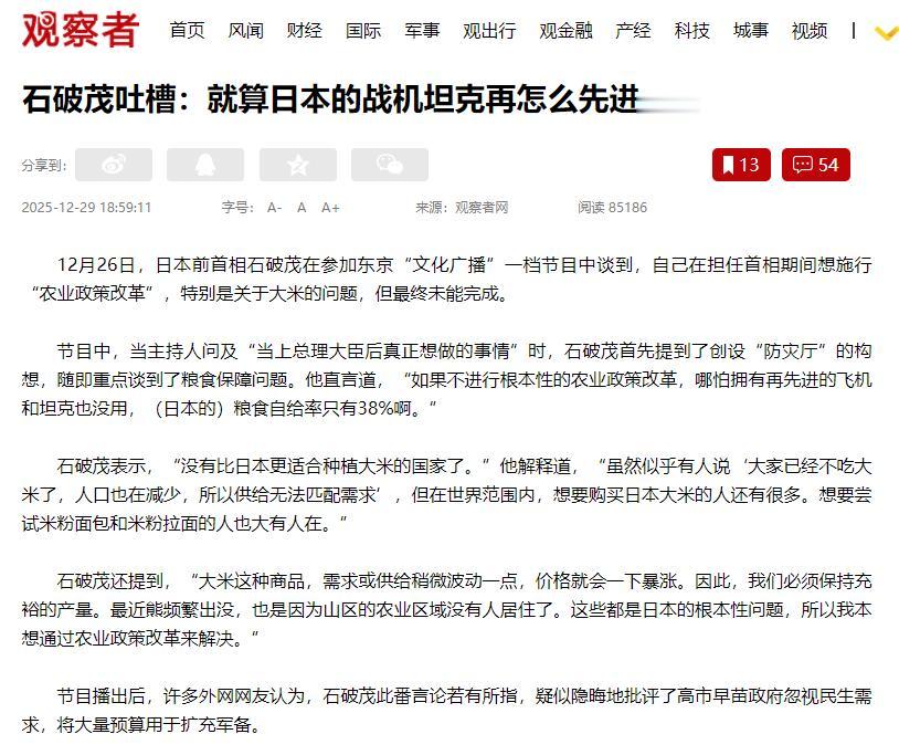 石破茂公开暗讽高市早苗: 就算日本的战机坦克再先进,粮食短缺问题不解决,一切白搭! 12月26日,日本前首相石破茂在东京一档广播节目里说话,在日本社会引起了不小的讨论,核心就是粮食够不够吃和政府该先办啥事儿。 主持人问他要是再当首相最想做啥,石破茂先提了要建防灾厅,接着就重点说粮食问题,直截了当地说:“不彻底改农业政策,就算有再先进的飞机坦克也没用,日本粮食自给率才38%。” 大家都觉得,这话是在暗讽高市早苗政府把很多资源都花在搞军备上,没太重视老百姓吃饭这种民生事儿。 对于石破茂这话,有人同意有人反对,反对的人觉得他把问题说严重了。但实打实的数据在这儿,38%的自给率不是编的,这些年一直都这样,在世界主要国家里算很低的。 说白了就是,日本人吃的东西里,只有38%是自己国家种的,剩下的62%都得从国外买,这种情况让日本的粮食供应很容易受外面情况影响。 粮食够不够吃,是国家能安稳运转的基础,这一点日本历史上有过惨痛教训。1918年发生的“米骚动”,就是因为米价突然涨得厉害,老百姓买不起吃不起,没法生活了才闹起来的。 这事儿从富山县的码头女工抗议开始,后来蔓延到京都、名古屋、大阪、东京好多地方,大家围堵粮仓、跟警察起冲突,最后直接把当时的首相逼得辞职了。这事儿也说明,粮食不够会直接让社会乱起来,连政权都可能不稳。 没想到一百年后,日本又遇到了类似的粮食难题。2024年夏天开始,日本闹起了“令和米荒”,东京、大阪这些大城市的超市,大米一摆上货架很快就被抢光,80%的商店都没米卖了,只能规定一户人家只能买一袋。 同时米价还一个劲涨,普通家庭都觉得压力大。到了现在,这价格更是没降下来,反而涨到了天价。 根据最新统计,最近一周日本市场上一袋5公斤装的大米,均价已经涨到4337日元,折合人民币差不多194块,创下了有统计以来的最高值,而且已经连续16周都维持在4000日元以上的高位。 面对这情况,高市早苗政府一开始说只是“短期问题”,没着急放储备的米,直到大家都怨声载道了才采取措施,不少人都把这跟当年“米骚动”时政府的应对方式放在一起比。 这次米荒,跟日本农业底子弱有很大关系。这些年,日本种地的地方越来越少,种地的人也大幅减少,2023年只有116万人,比2000年少了一半还多,年轻人都不愿意种地,粮食产量自然上不去。 另外,日本之前还搞过让农民少种大米的政策,给改种小麦、大豆的农民发补贴,想平衡粮价,可这也让大米库存越来越少,2024年6月底民间大米库存只剩156万吨,这也是米荒闹起来的重要原因。 值得说的是,农业这么弱、粮食供应有风险,高市早苗政府还把不少预算花在搞军备上。 其实国防安全和老百姓的基本生活保障,都是国家该管的大事,钱该先花在哪个上面,本来就容易有争议。 石破茂自己当首相的时候,也想过改农业政策,尤其是大米相关的,但没做成。他这次说这些话,本质上就是不认同现在政府的做事重点,希望政府能重新考虑,平衡好粮食安全和军备投入的关系。 有人说日本有钱,直接从国外买粮食就行,可这其实很不安全。国际粮食市场受战争、天灾、贸易纠纷这些影响很大,不稳定。 2022年就出现过国际粮价涨、日元又贬值的情况,直接让日本买粮食的成本变高,国内食品价格也跟着涨。 而且日本自己存的粮食也不多,政府储备的大米只够全国人吃两个月左右,2024年米荒的时候,储备米放出去后库存只剩15万吨,只能紧急从国外进口补缺口,这也能看出来日本粮食供应体系很脆弱。 总的来说,石破茂这话的核心就是想强调,粮食够不够吃对国家稳定很重要,这也让日本国内好好讨论了下政府该先办啥事儿。 1918年的“米骚动”和2024年的“令和米荒”,不管是历史还是现在,都说明粮食稳定的重要性。 对高市早苗政府来说,怎么平衡搞军备和保障民生,怎么改农业政策提高粮食自给能力,都是现在要解决的大问题。 这事儿的本质就是不同的施政想法碰撞,也能看出来国家钱有限的时候,要平衡好多个发展目标有多难。