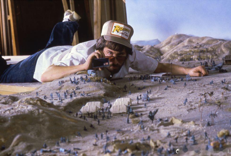 一张斯皮尔伯格在拍摄《夺宝奇兵》时面对微缩模型时的片场照
