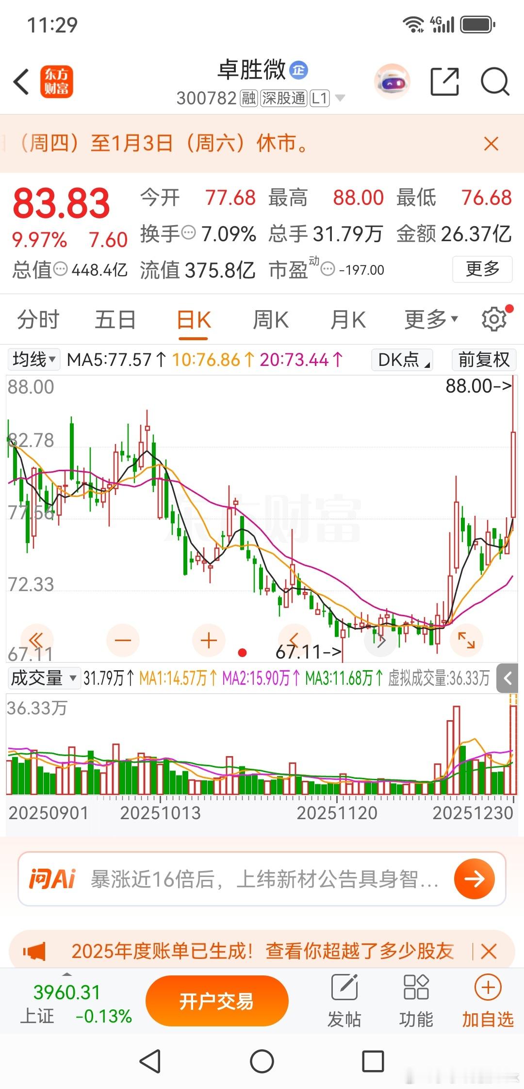 卓胜微,好久没有去关注这个货了,要不是今天大涨10%,我都把他忘记了。曾经的射频龙头,早已不复当年之勇了,从高位339跌了四年了。真心希望,今年大涨的科技大牛,不要去重蹈卓胜微的覆辙。欢迎加入我们的免费交流群。财经股票