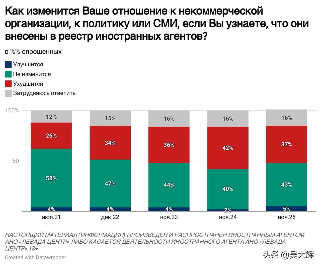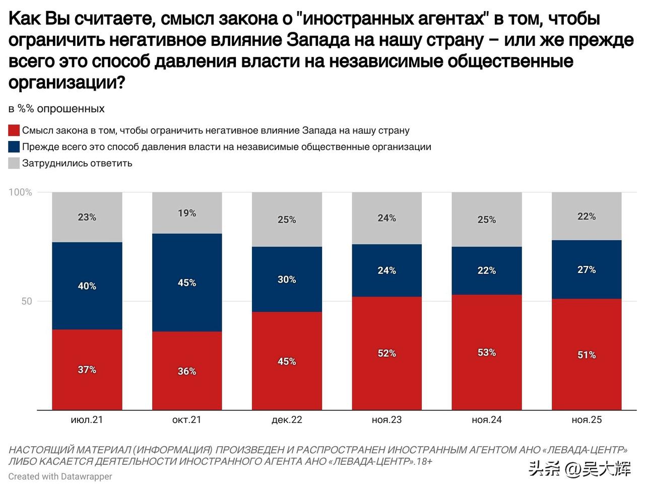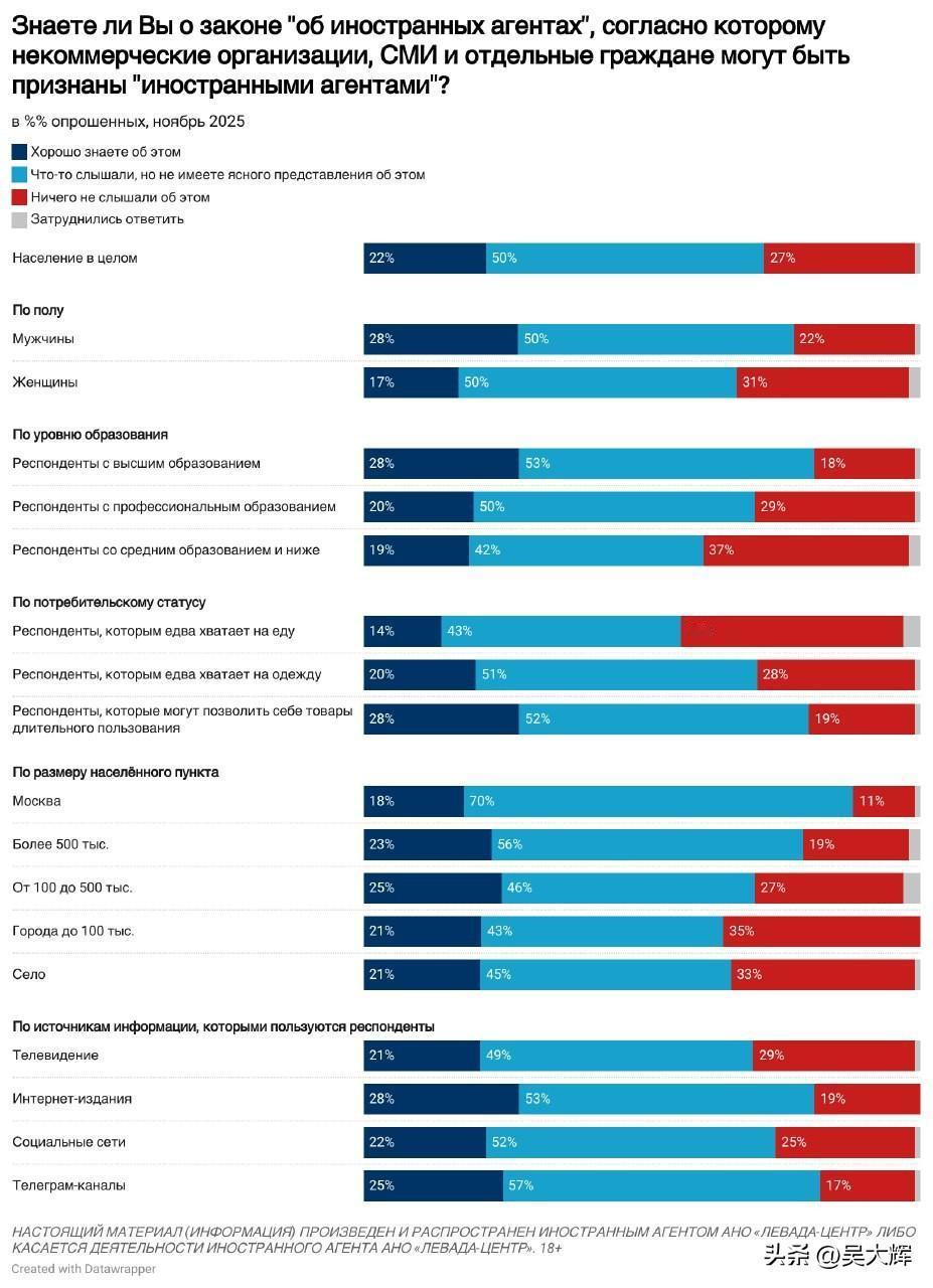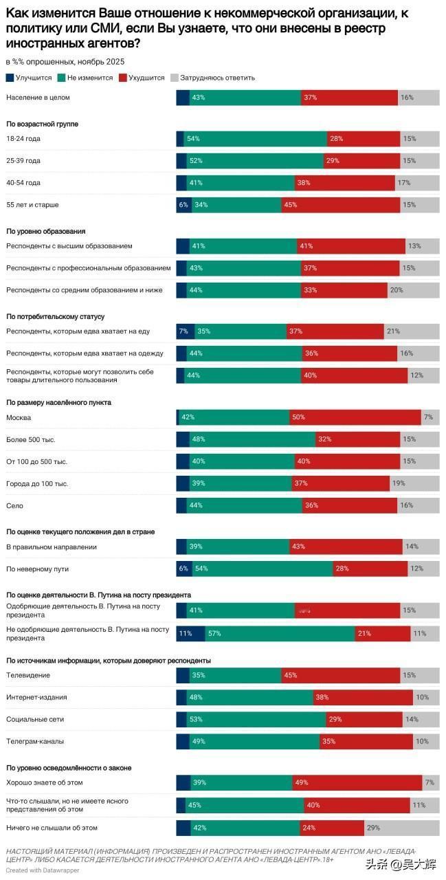 【列瓦达民调:关于民众对“外国代理人”的普遍看法(2025年11月)】 -- 民众对于《外国代理人法》的知晓度持续上升,目前72%的受访者表示了解该法律(较2021年7月上升30个百分点)。 -- 半数受访者(51%)认为,该法律的立法初衷是限制西方对俄罗斯的负面影响;四分之一受访者(27%)则认为,这首先是当局向独立社会组织施压的一种手段。 -- 约三成七的受访者(37%,较2024年11月下降5个百分点)表示会对被认定为“外国代理人”的对象持负面态度;43%的受访者表示态度中立;仅5%的受访者表示会持正面态度。负面评价的增长态势已停止。