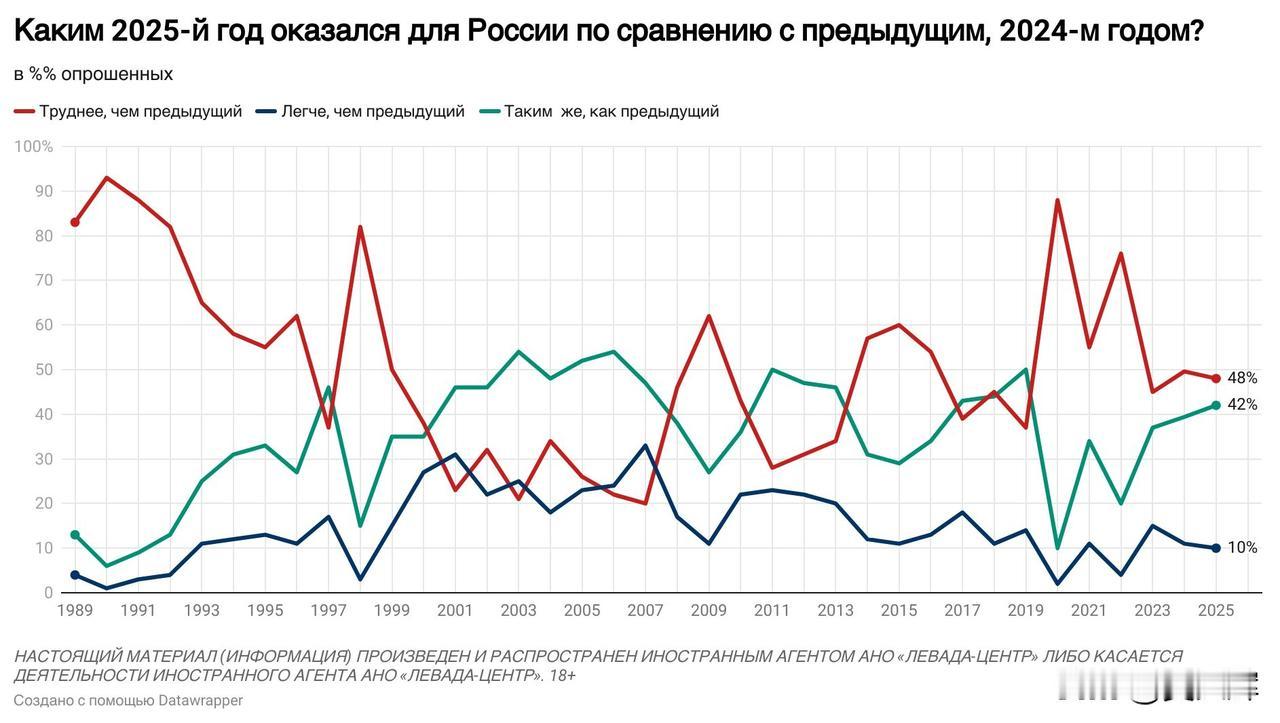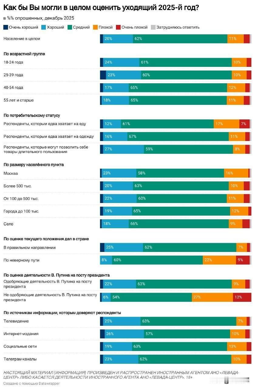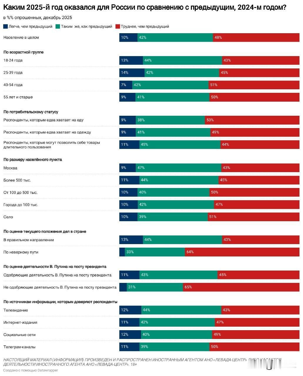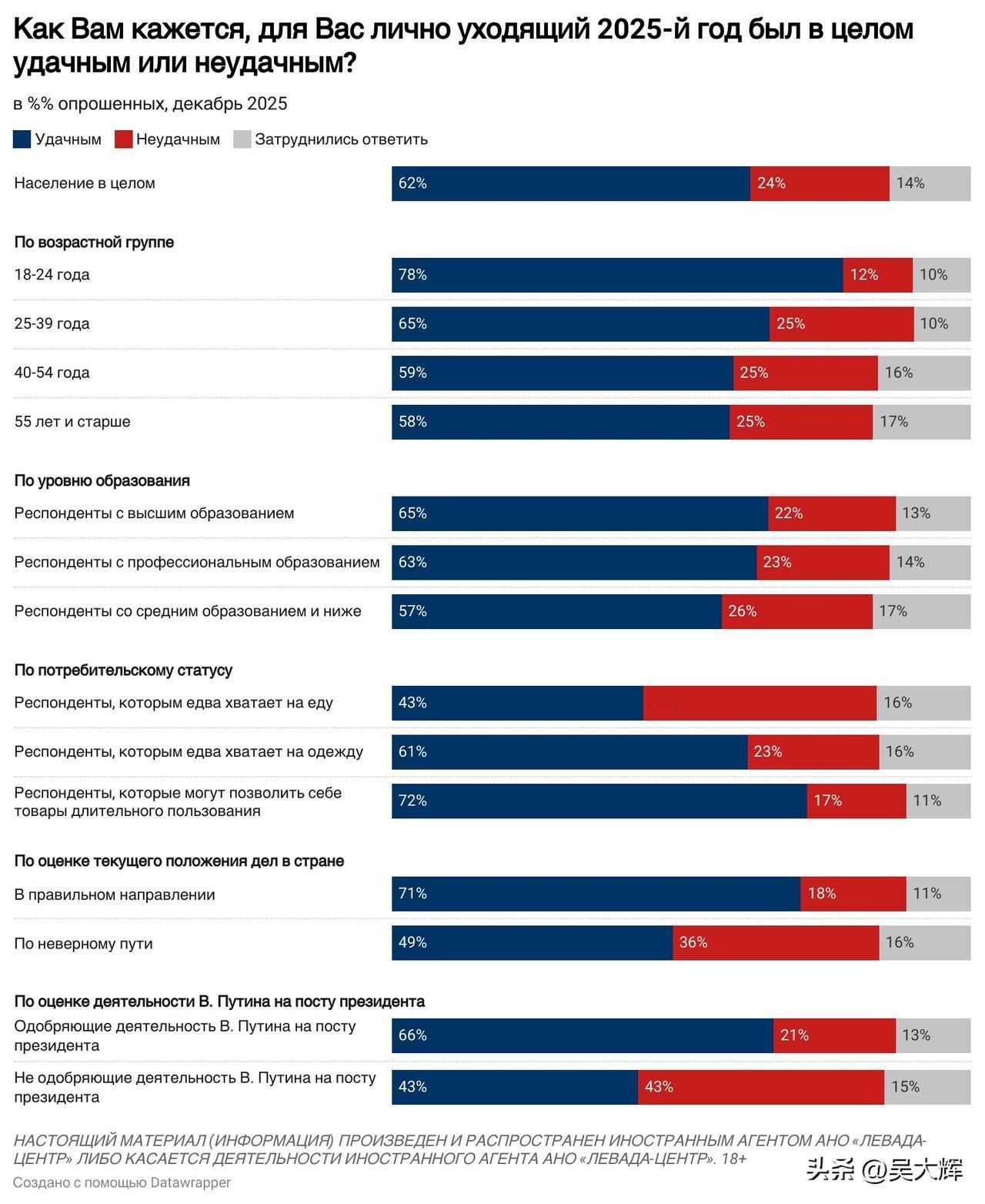 【列瓦达关于2025年总结的民调:重大事件、民众评价及与往年对比】 -- 受访者将本年度的重大事件列为以下几项: 1⃣ 物价与各类资费上涨(34%); 2⃣ 弗拉基米尔·普京与唐纳德·特朗普在阿拉斯加举行会晤(29%); 3⃣ 乌克兰无人机发动袭击(28%); 4⃣ 移动网络故障及即时通讯软件遭封禁(25%); 5⃣ 库尔斯克州收复(23%)。 -- 大多数受访者将本年度评价为“平平将本年度评价为“平平无奇”——占比63%;认为是“丰年”的占22%;认为是“灾年”的占15%。 -- 认为本年度国家发展处境较往年更为艰难的受访者,与认为和往年基本持平的受访者占比近乎相当,分别为48%和42%;另有10%的受访者认为本年度处境比往年更为宽松。 -- 近半数受访者(49%)认为,本年度其个人及家庭生活状况与往年持平;38%的受访者认为生活变得更为艰难;13%的受访者认为生活有所好转。 -- 近三分之二的受访者(62%)认为本年度总体顺遂;认为不顺遂的占24%。