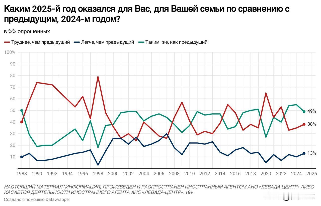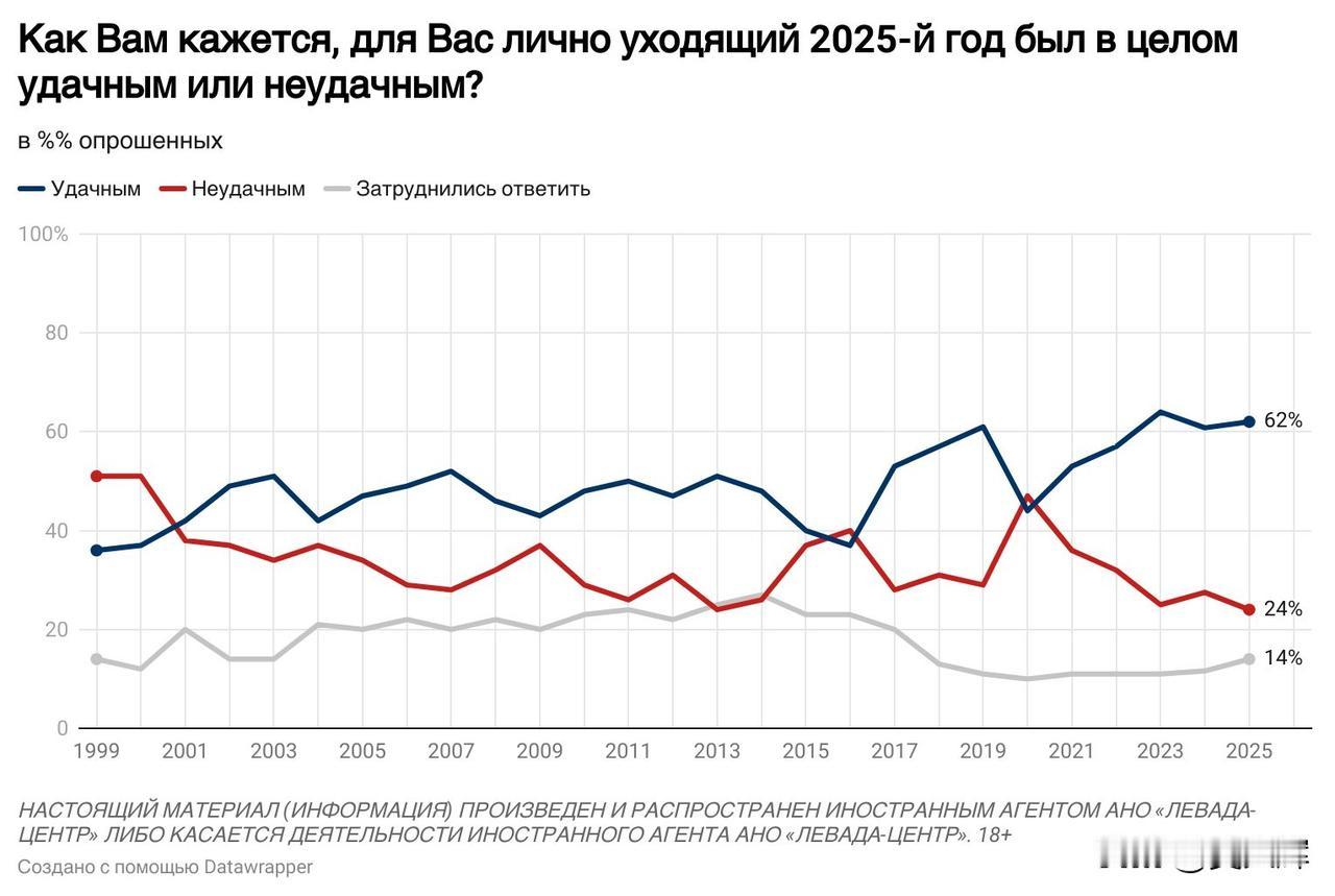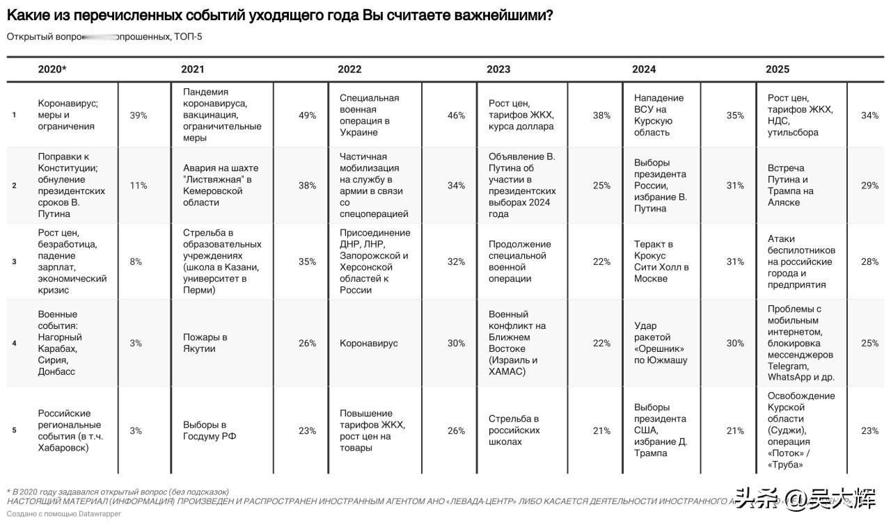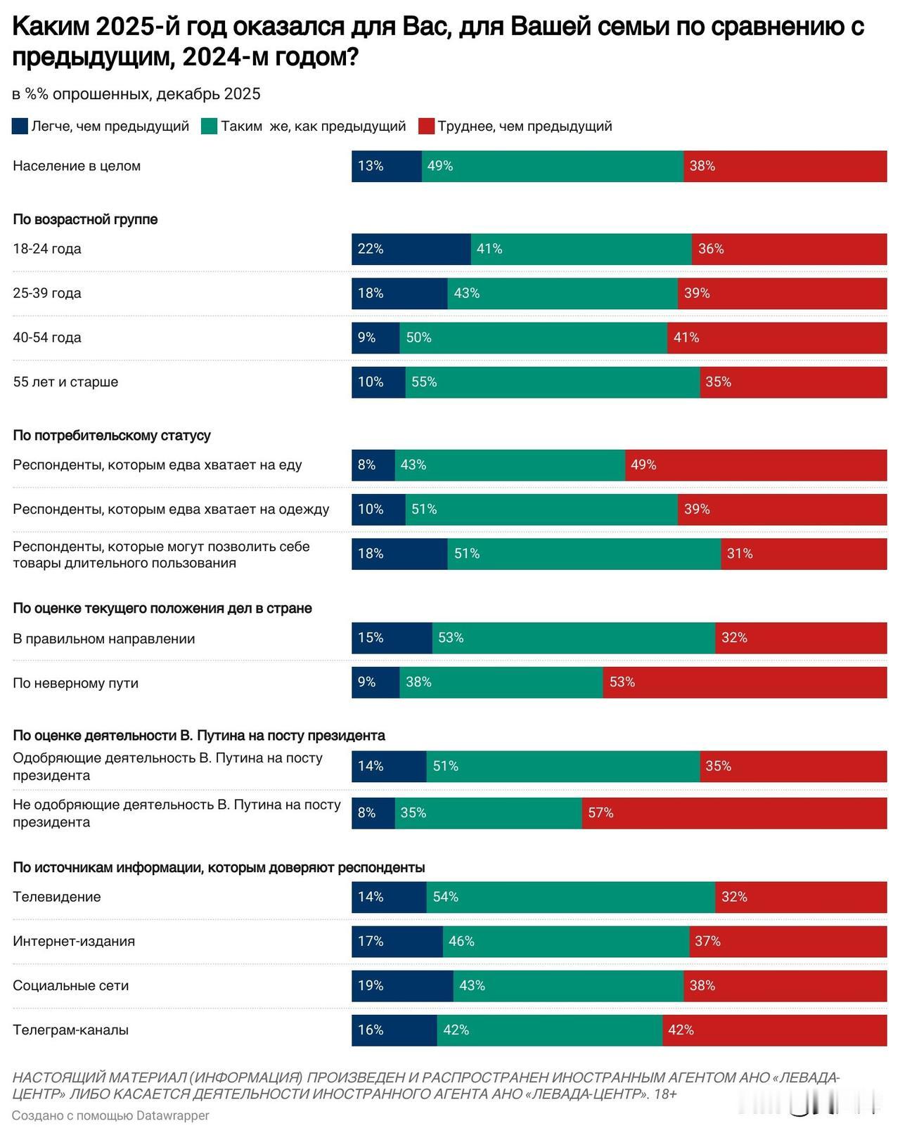 【列瓦达关于2025年总结的民调:重大事件、民众评价及与往年对比】 -- 受访者将本年度的重大事件列为以下几项: 1⃣ 物价与各类资费上涨(34%); 2⃣ 弗拉基米尔·普京与唐纳德·特朗普在阿拉斯加举行会晤(29%); 3⃣ 乌克兰无人机发动袭击(28%); 4⃣ 移动网络故障及即时通讯软件遭封禁(25%); 5⃣ 库尔斯克州收复(23%)。 -- 大多数受访者将本年度评价为“平平将本年度评价为“平平无奇”——占比63%;认为是“丰年”的占22%;认为是“灾年”的占15%。 -- 认为本年度国家发展处境较往年更为艰难的受访者,与认为和往年基本持平的受访者占比近乎相当,分别为48%和42%;另有10%的受访者认为本年度处境比往年更为宽松。 -- 近半数受访者(49%)认为,本年度其个人及家庭生活状况与往年持平;38%的受访者认为生活变得更为艰难;13%的受访者认为生活有所好转。 -- 近三分之二的受访者(62%)认为本年度总体顺遂;认为不顺遂的占24%。