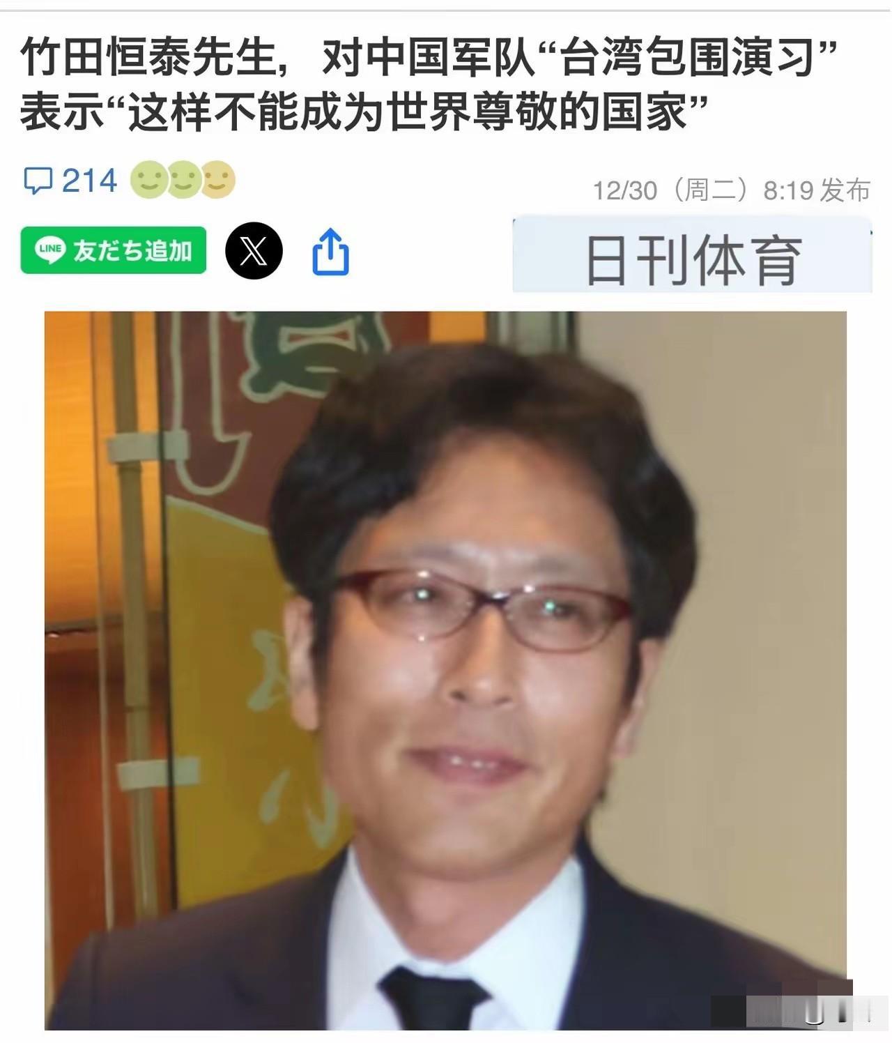 针对中方军演!日本人表态! 自称是日本天皇后裔的竹田恒泰29日在社交媒体上妄言称,“中国就是这样野蛮的地方。区分使用糖果和鞭子,控制周边各国,从几千年前就没有改变。这样的话,就不能成为世界尊敬的国家。” 但这个跳得最欢的右翼分子,真面目早就被扒得底朝天! 他所谓的"皇室后裔"身份纯属自我炒作——日本皇室只认男系血统,竹田家早在1947年就脱离皇籍,他与现任天皇的血缘比陌生人还远,这辈子从没当过一天皇族。更讽刺的是,这个指责别人"野蛮"的人,自己早已被日本最高法院定性为"种族歧视者"。 2022年,竹田恒泰因不满他人批评其歧视言论起诉维权,结果被日本最高法院驳回全部诉求。判决书明确指出,他在书中辱骂中国人"民智未开"、诋毁韩国是"敲诈勒索惯犯",其言论本质是"将自国置于优越地位,把他国国民视为劣等"的种族歧视。更恶劣的是,他还编写美化侵略历史的"毒教材",试图向日本青少年灌输"皇国史观",将南京大屠杀轻描淡写,甚至宣称"满洲国建国是正当的",其用心极其险恶。 值得注意的是,竹田的狂言并非孤例。此次中方军演旨在震慑"台独"、警告外部势力,完全是维护国家主权的正当行动,却遭到日本方面集体炒作——日媒无端指责军演"破坏地区稳定",政府还炒作"实弹落入专属经济区"的虚假关切。但正如外交部发言人霸气回应:中国军演符合国际法,日方应摒弃冷战思维,停止无端指责! 一边是被本国司法系统认定的种族歧视者,一边是无视事实的右翼炒作,日本部分势力的操作实在可笑。中国从不主动惹事,但也绝不怕事——军演是捍卫主权的正义之举,历史真相不容篡改,任何企图抹黑中国的图谋,终将被钉在历史的耻辱柱上!