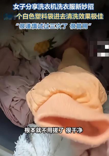 “解释不清了!”山东一女子,用洗衣机洗衣服时,意外发现洗过的衣服特别干净,连边角油渍都洗掉了!她有点纳闷,却突然发现滚筒里不知何时混进去了一个白色塑料袋,而这就是关键所在! 山东青岛一位女士的洗衣经历,在网上引起了不少人关注,说起来这事儿还挺巧,就是咱们平时都能遇到的日常场景,却藏着个实用小发现。 这位女士像往常一样用洗衣机洗衣服,晾衣服的时候却愣住了,这次的衣服洗得格外干净,连平时最头疼的孩子袖口、衣服边角的顽固污渍,竟然都被洗掉了。 要知道,这些地方以前她都得单独拿出来手搓,不然根本清不干净。 她有点纳闷,琢磨着是不是洗衣液放多了,还是洗衣机模式调得不对? 仔细检查了一遍洗衣机滚筒,才发现里面竟然藏着一个白色塑料袋。 她忽然反应过来,大概率是之前洗衣服没掏干净口袋,这塑料袋跟着衣服混洗了一整遍,难道这就是衣服变干净的关键? 光靠一次巧合可不算数,这位女士也挺谨慎,没立马把这个发现分享出去,之后两次洗衣服,她特意找了干净的白色塑料袋,每次放两个进去试了试。 结果还真没让人失望,衣服确实比平时洗得透亮,那些原本需要手搓的领口、袖口污渍,不用额外费力就能洗干净,连袜子都比之前洗得清爽,确定这方法管用后,她才把这个小妙招分享到了社交平台。 帖子发出去后,不少网友都来讨论,有人好奇这到底是什么原理,也有人跑偏了,纠结起衣服和袜子能不能一起洗的问题。 其实说白了,这方法能管用,核心还是改变了洗衣机的洗涤状态。 咱们都知道,洗衣机洗得干净不干净,主要靠水流翻滚和衣物之间的摩擦,有些污渍洗不掉,不是洗衣液不行,而是衣服边角容易贴在桶壁上,水流和摩擦都没到位,洗涤剂根本渗不进去。 白色塑料袋放进去之后,就成了个“不规则搅动物”,它不会跟着衣服乖乖打转,反而会被水流推着到处跑,时不时就插到衣服中间,把贴在一起的衣服撑开。 这样一来,水流和洗涤剂就能充分接触到衣服的每一个部位,摩擦也更均匀,脏东西自然就容易被带出来了。 另外还有个容易被忽略的点,塑料袋表面光滑,在高速水流里会产生静电,能把衣服上的细小毛絮和灰尘吸走,洗完的衣服也就不会显得灰蒙蒙的。 不过要提醒一句,这招也不是万能的,选塑料袋得注意,一定要选白色的,彩色的容易掉色污染衣服,最好是无印刷的食品级PE袋,厚实一点、结实一点的,太脆的容易被搅烂,碎片粘在衣服上反而麻烦。 数量也不用多,两三个就够,放多了会影响洗衣机正常翻滚,反而起反作用。 还有,丝绸、羊毛这种娇贵的面料可别用这方法,容易被塑料袋刮伤。 其实类似的物理增摩方法还有不少,比如有人会在洗衣机里放几个空矿泉水瓶,原理都差不多。 但不管用哪种方法,要是遇到特别顽固的油渍,还是得先预处理一下,别指望靠一个塑料袋就能解决所有问题。 生活里的小智慧往往就藏在这种意外里,这位青岛女士的细心确实帮了不少人,不过也有人觉得这方法不靠谱,担心塑料袋会污染衣服或者损伤洗衣机。 对此你有什么不同的看法,可以在评论区留言讨论!!!