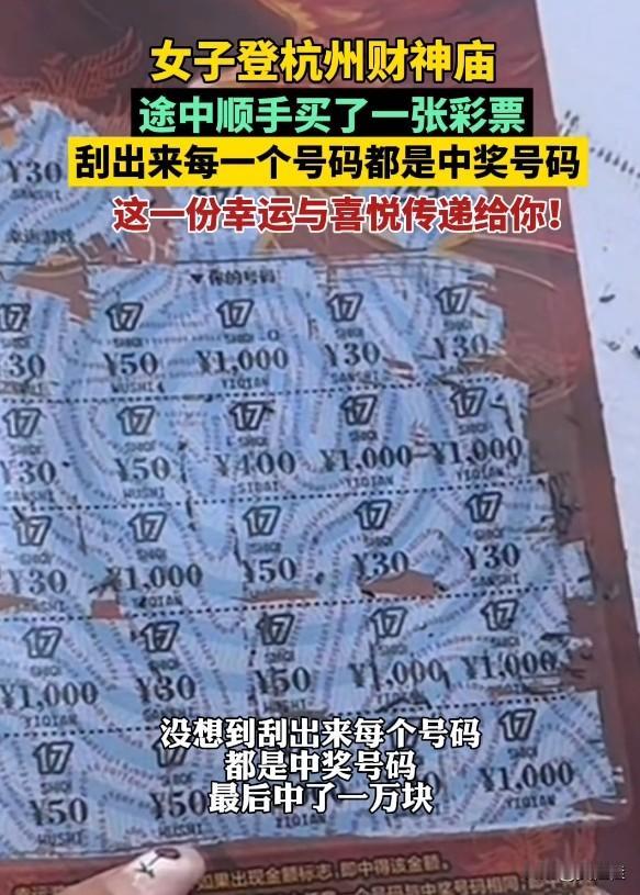 这也太灵了吧!登财神庙路上随手买张刮刮乐,居然每个号码都中奖,最后薅到一万块大奖! 12月30日浙江杭州,女子去“天下第一财神庙”祈福,路过彩票店随手买了张刮刮乐,刮开后傻眼了——每一个号码全是中奖号,直接拿下一万元奖金。网友都笑称这是财神爷亲自塞红包,这波好运谁看了不羡慕!