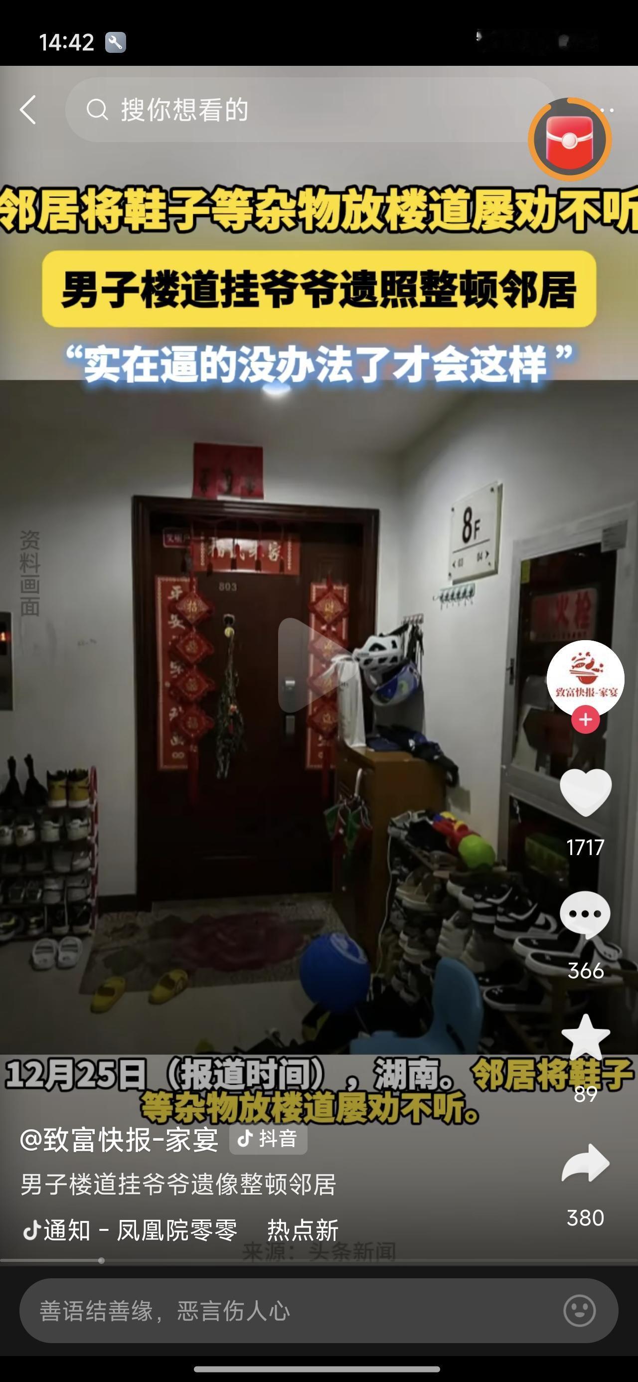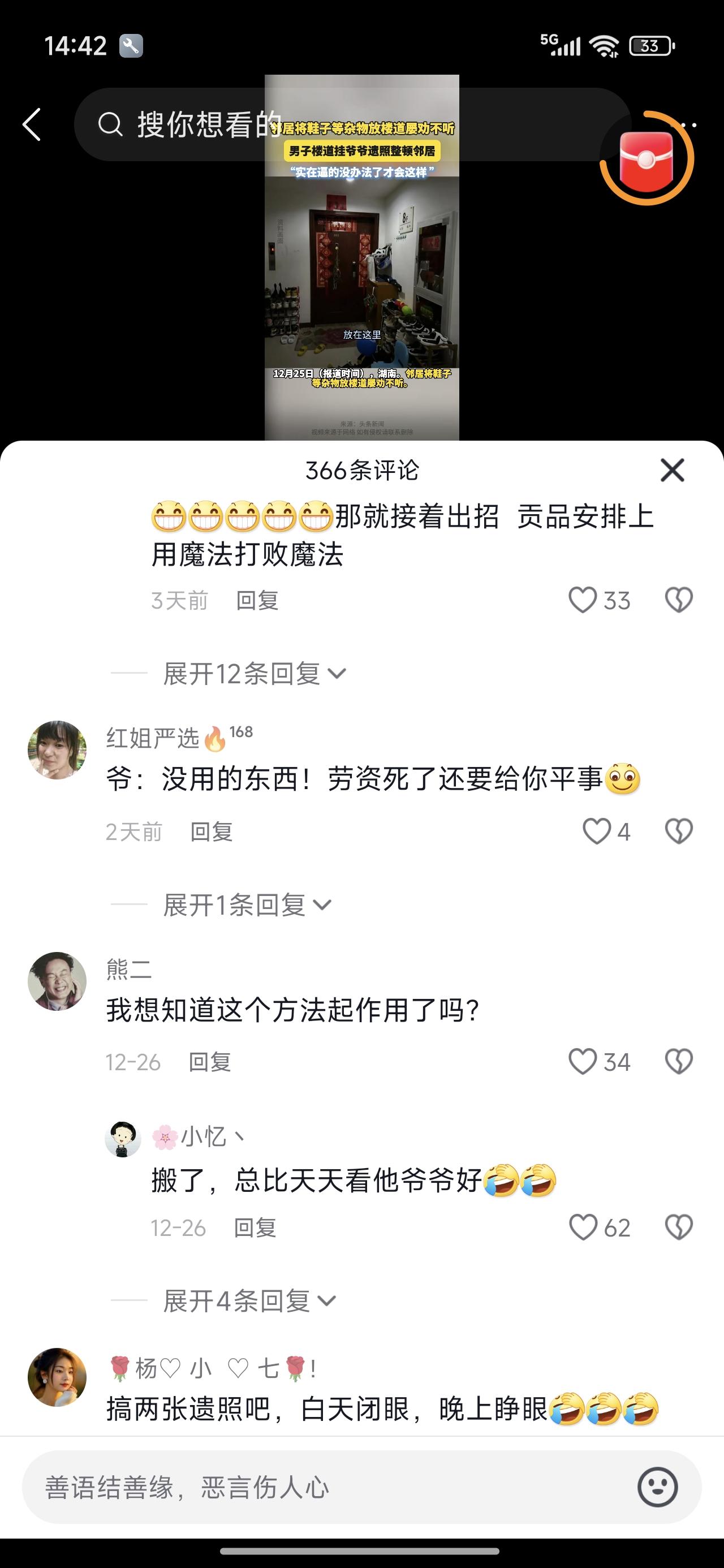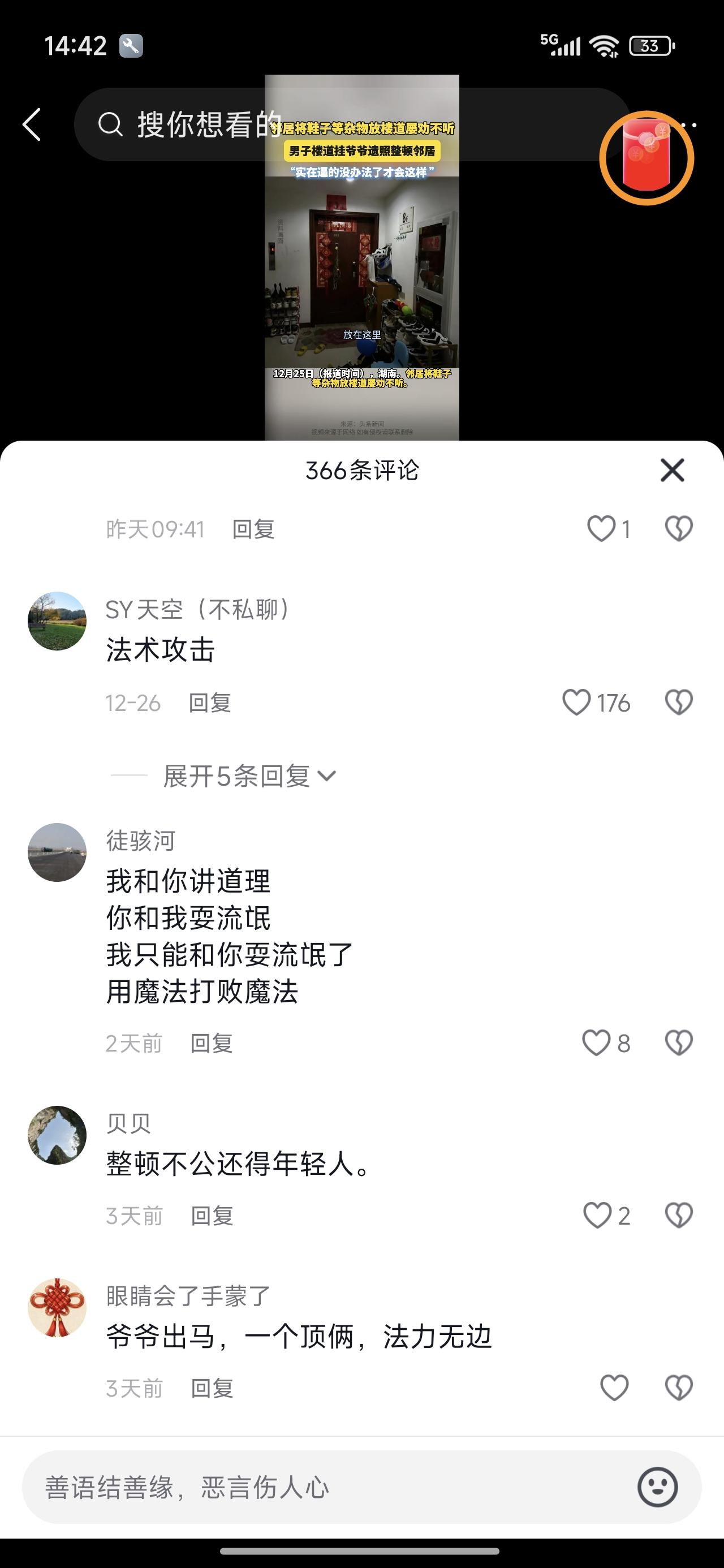 楼道里放鞋臭烘烘的清理不掉的,有办法了!喷臭豆腐水已经过时了!魔法对哄的终极大招来了。 这位同学在网上发了视频,求救于广大网友,网友中还真有机灵的,说你把家里祖宗的遗照挂出来,对着他家,底下摆上供桌,点上三根香。让你爷爷或太爷爷帮你。 太有效果了,果不其然,邻居吼不住了,第二天就把鞋柜搬了。这招实打实的帮助了网友。不费一兵一卒,解决了问题。 之前的找物业,物业也不能怎么滴了人家。网友真是脑洞大开啊!有事儿是真上啊!