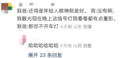 我爸:还得是年轻人眼神就是好。 我:没有啊,我散光现在晚上这信号灯我看着都有点重影。 我爸:那你不开车灯