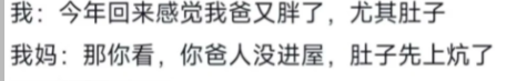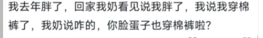 我去年胖了,回家我奶看见说我胖了,我说我穿棉裤了,我奶说咋的,你脸蛋子也穿棉裤啦?