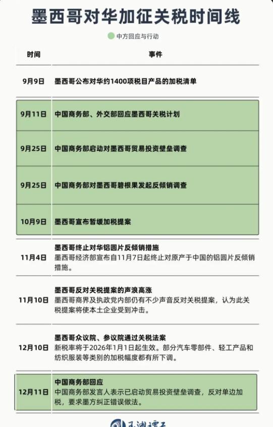 既然给脸不要脸,那就准备接招!北京驻墨使馆的怒斥,只是第一声发令枪。 中国这次不仅要骂,更要打,而且要往死里打!墨西哥想纳“投名状”讨好美国?行,那我们就成全你,直接切断你制造业的“大动脉”。 不把你揍得满地找牙,别的国家还以为中国是只没牙的老虎! 可能很多人还没看清这场风波的本质,墨西哥这波对华加征高额关税的操作,表面是所谓的“保护本土产业”,实则是揣着明白装糊涂,甘愿当美国遏制中国的马前卒。 从9月抛出加税提案,到12月国会强行通过,中方给足了台阶,可墨西哥偏要一条道走到黑,那就别怪我们翻脸不认人。 我们先把时间线理清楚,让大家看看中方是如何一步步留余地,又如何被墨西哥无视的。 今年9月9日,墨西哥突然公布关税改革提案,计划对包括中国在内的未签署自贸协定国家,约1400项税目产品加征最高50%的关税。 消息一出,商务部立刻表态密切关注并开展评估,25日就正式启动贸易投资壁垒调查。 这里要特别说明,以往这类调查都是企业或产业提请,这次是中方首次自主立案,足以说明墨西哥的针对性有多明显,已经触碰了我们的底线。 中方选择先启动调查而非直接反制,其实是留了磋商空间。 中国政法大学的专家就曾解读,贸易投资壁垒调查更多是一种警示,背后还有更具力度的工具没动用。 墨西哥起初也确实有所忌惮,不仅暂缓了提案推进,最终通过的版本里,部分产品税率也明显下调。 可这种妥协没能坚持到最后,提案还是落了地,问题的根源很明确,就是美国在背后施压。 墨西哥国会通过提案后,美国总统贸易顾问纳瓦罗直接欢呼,称这是美国改变国际贸易秩序的里程碑,这话把窗户纸捅得明明白白,墨西哥就是在给美国交“投名状”。 墨西哥的算盘打得精,想借着《美墨加协定》2026年审议的机会,靠打压中国讨好美国。 可它忘了自己的经济命脉早就和中国深度绑定,动中国就是动自己的饭碗。 中国是墨西哥第二大汽车零部件供应国,2024年对墨出口的汽车零部件中,70%都是高精度传感器、电控单元这类核心部件,墨西哥本土企业根本造不出来。 纺织行业更依赖中国,上游的化纤、面料几乎全靠进口,要是真加征高额关税,本地成衣厂成本会直接飙升,在美国市场的竞争力也会一落千丈。 墨西哥工商界其实早就看清了后果。 汽车工业协会算过一笔账,加税会不可避免推高生产成本,引发通胀,这些都是墨西哥当前极力避免的问题。 进出口商协会主席也直言,一旦征税,进口成本会增加30%,部分产品价格可能翻倍,最终埋单的还是普通民众。 更讽刺的是,墨西哥在20世纪中期就推行过类似的高关税进口替代政策,短期看似建了工业体系,可长期保护让产业失去竞争力,等到80年代拉美债务危机爆发,本土产业不堪一击,经济遭受重创。 如今重走老路,无疑是雪上加霜。 墨西哥或许觉得有美国撑腰就安全,可它没搞清楚,现在的中国早已不是任人拿捏的软柿子。 这些年我们的贸易政策工具箱越来越完善,仅今年商务部使用政策工具的次数就从去年的23次提升到47次,除了传统手段,还有反歧视调查、产业竞争力调查以及不可靠实体清单等新型工具。 针对墨西哥,我们手里的牌有很多,正在推进的贸易投资壁垒调查已经在通过问卷、听证会、实地调查等方式收集证据,后续完全可以针对墨西哥的优势敏感产业采取精准措施,也可以在世贸框架下依法起诉。 商务部研究院的专家曾点醒墨西哥,它需要好好掂量三个问题。 一是成本问题,破坏贸易规则会损害国家信誉,关税成本最终会传导到本土企业和消费者身上,反而降低对外资的吸引力;二是风险问题,这次加税覆盖所有未签自贸协定的国家,范围太广,很容易引发连锁贸易争端,让国内企业面临更多不确定性;三是发展空间问题,中墨合作不只是传统产业,还有新能源、科技等领域的投资和技术转移,信任一旦受损,会直接拖累墨西哥的长期发展和产业多元化目标。 贸易的本质是各取所需,顺差逆差是各国发展阶段和产业分工的客观结果,靠加税压缩进口根本不会让真实产出增加。 解决分歧的方式有很多,深化合作开拓更多贸易可能才是正途,而非把贸易水平拉低到谷底。 对墨西哥来说,现在还有选择的机会,是在封闭中消耗竞争力,还是回到磋商合作的正轨,答案显而易见。 中方一直强调“应对措施”而非“反制措施”,始终没关上合作的大门,前提是墨西哥撤回相关提案。 可如果墨西哥执意一条道走到黑,我们也不会再手软。 这次驻墨使馆的怒斥只是开始,后续的应对措施会精准落地,直接切断它制造业的“大动脉”。