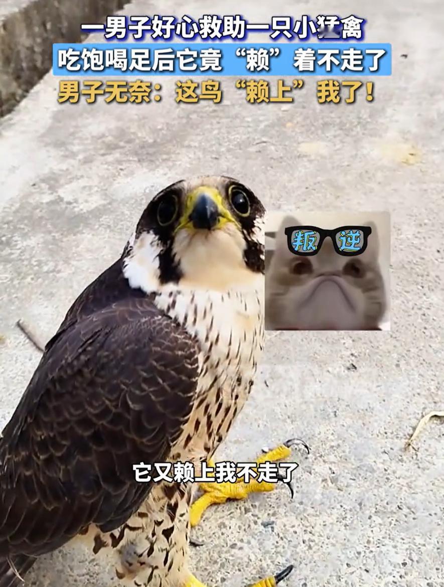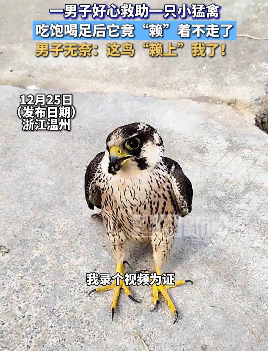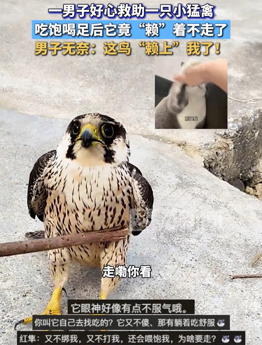 差点解释不清了!浙江温州,男子家中突然飞进来一只怪鸟,后来一查发现是一只国家二级保护动物,谁知男子好心救助后,对方却赖上了男子,完全没有飞走的意思,男子也是吓得连忙拿出手机拍视频为证,证明这只怪鸟与自己无关 视频中,男子有些哭笑不得,对着怪鸟说道:录个视频为证,我没绑你,也没打你,喂饱了你,你怎么还不走?我知道你是国家二级保护动物,走喽,你快去找吃的去 男子介绍,当时这只怪鸟突然飞到自己家的院子中,看它站在地上一动不动,觉得可能是受伤了,鸟倒也不怕人,慢慢吃了点东西 当时趁这工夫拿手机查了查,不查不知道,一查心里一紧:游隼,国家二级保护动物。他心想,这可得小心对待,别惹出什么误会 吃饱喝足后,男子看它翅膀完好,精神头也不错,就找了根小树枝,轻轻碰了碰它的脚,要撵它走。可那游隼偏不动,两只圆眼睛直勾勾盯着他 有网友调侃说:这里有吃有喝,人家干嘛要走? 当然,这只是玩笑话,其实这游隼赖着不走,可能真不是要讹人。鸟类有时候飞到陌生环境,尤其是人类居住区,会有一段观察和适应的时间。也可能它之前在城市里生活过,不太怕人,甚至觉得这里安全。当然,也不排除它确实有点累了,或者需要一点时间恢复体力 所以说,和野生动物打交道,真得有点常识。保护动物是好事,但保护的方式也得讲究科学和规矩。要是真遇到类似情况,最好的办法还是联系林业部门或者野生动物救助站,让专业的人来处理