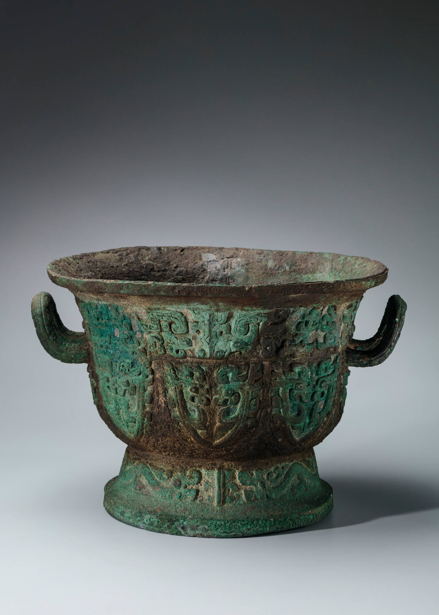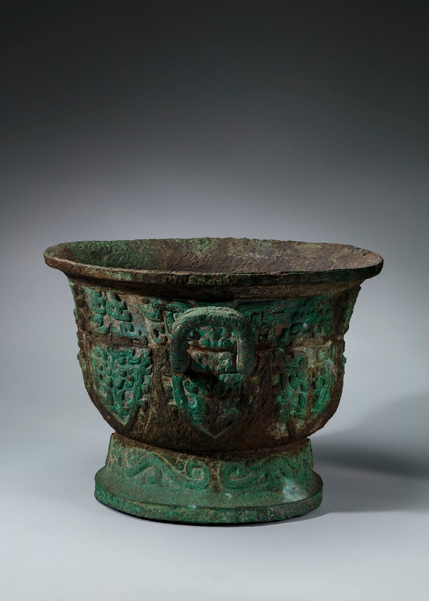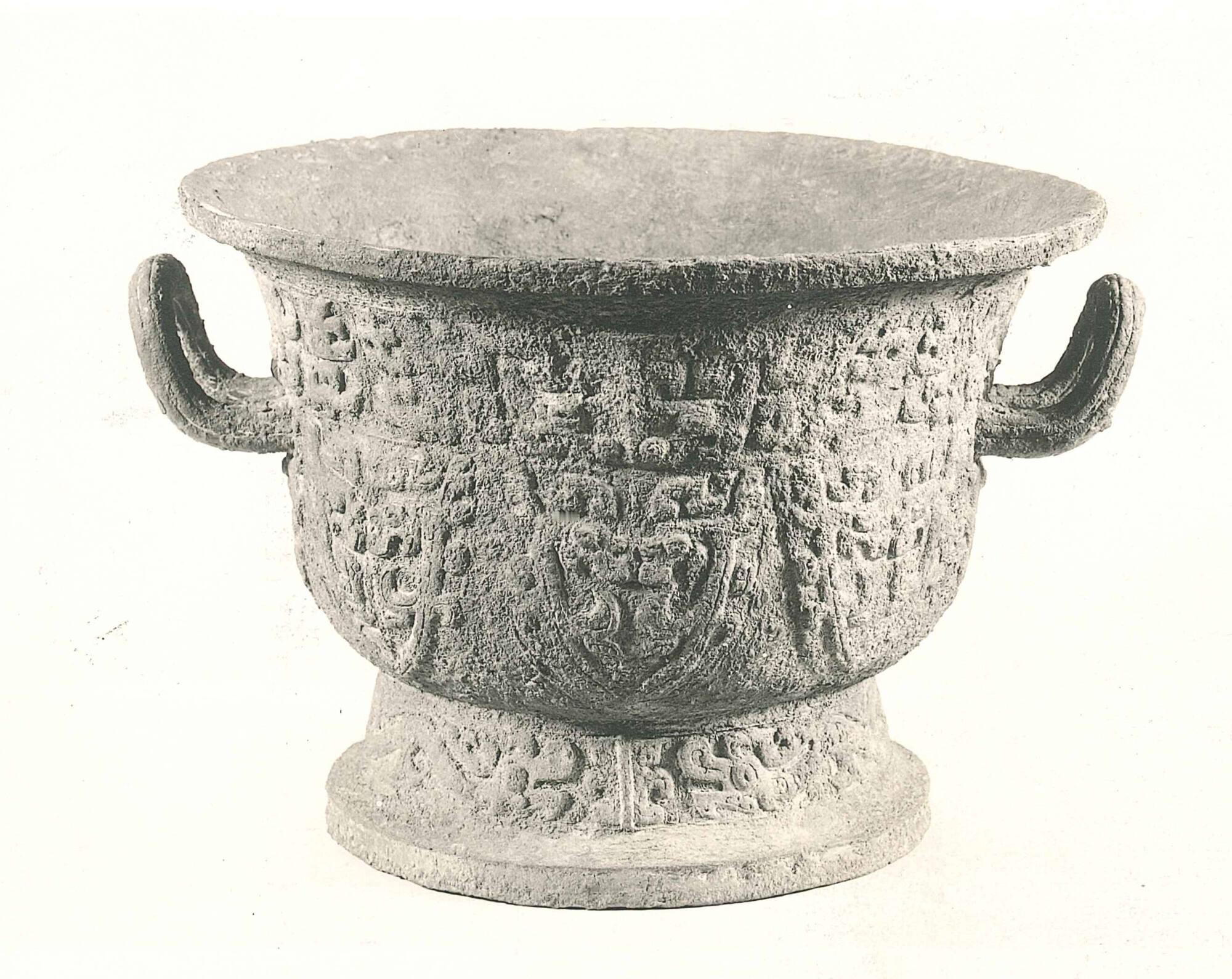 每天一件青铜器 美国Toledo美术馆藏西周中期:兽面纹盂. 铭文:"X作庚丙宝尊彝".纹饰非常特别,线条非常粗,但非常规整.蕉叶纹都是由一对龙组成,上方则是罕见的兽面纹纹,圈足饰弓身的爬龙.