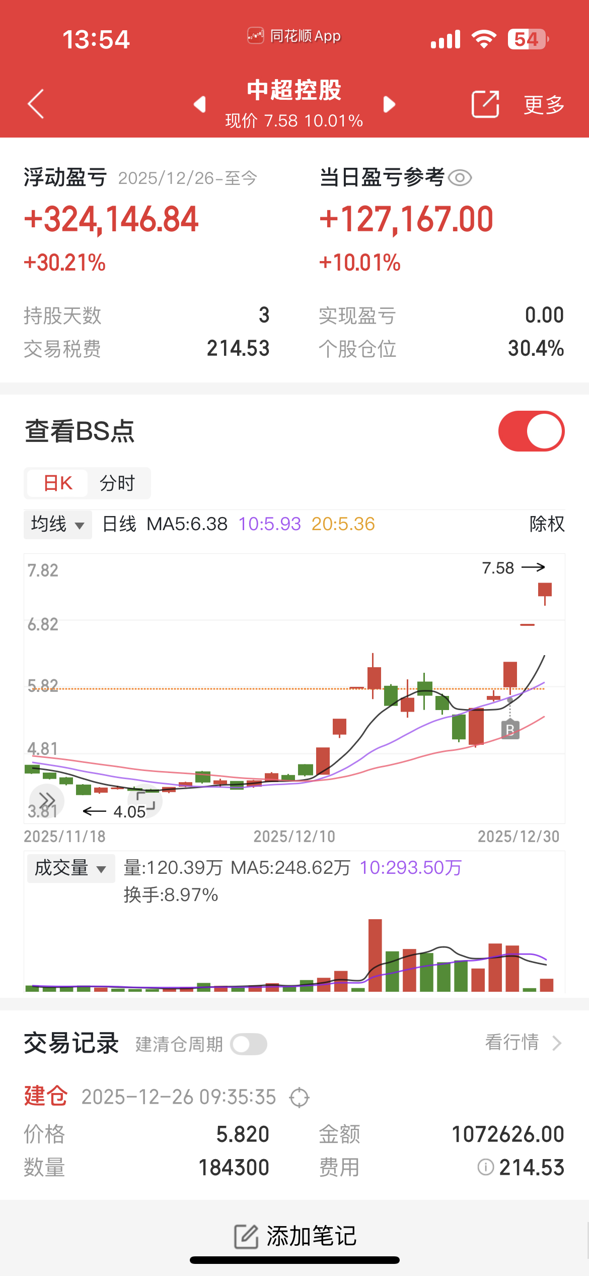 12月26号买入的$中超控股 sz002471$ 收获3连板!