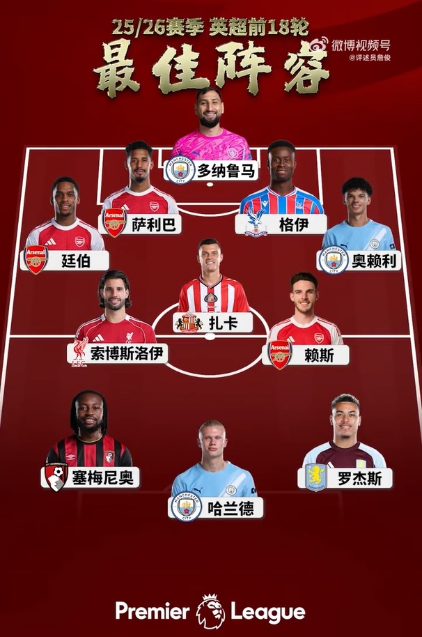 #詹俊评英超半程最佳阵容#英超第19轮比赛即将开打,解说詹俊在社媒晒出了自己认为的英超半程最佳阵容。詹俊老师表示:英超第19轮打完要等到明年了,个人今天就先评选一个自己心目中的半程最佳阵容。欢迎各位在评论中给出你们的意见。这次的半程最佳阵,阿森纳3人入选,曼城也有3人,水晶宫、桑德兰、利物浦、伯恩茅斯和阿斯顿维拉各一人入选。