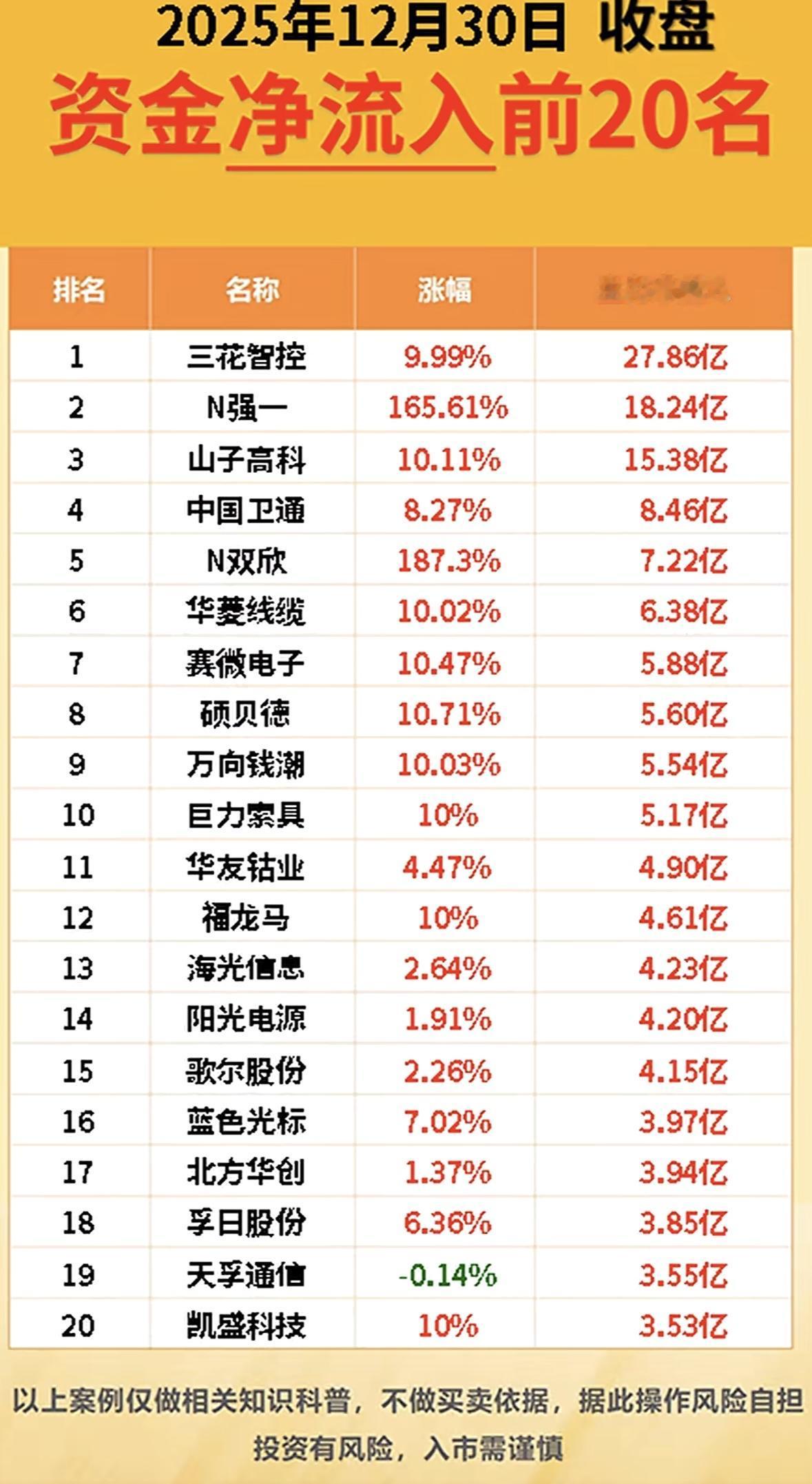 2025年12月30日收盘,资金净流入前20名公司揭晓! "2025年末资金流向: 三花智控领涨27亿, N强一吸金18亿, 新能源与科技股受热捧, 投资需谨慎。"