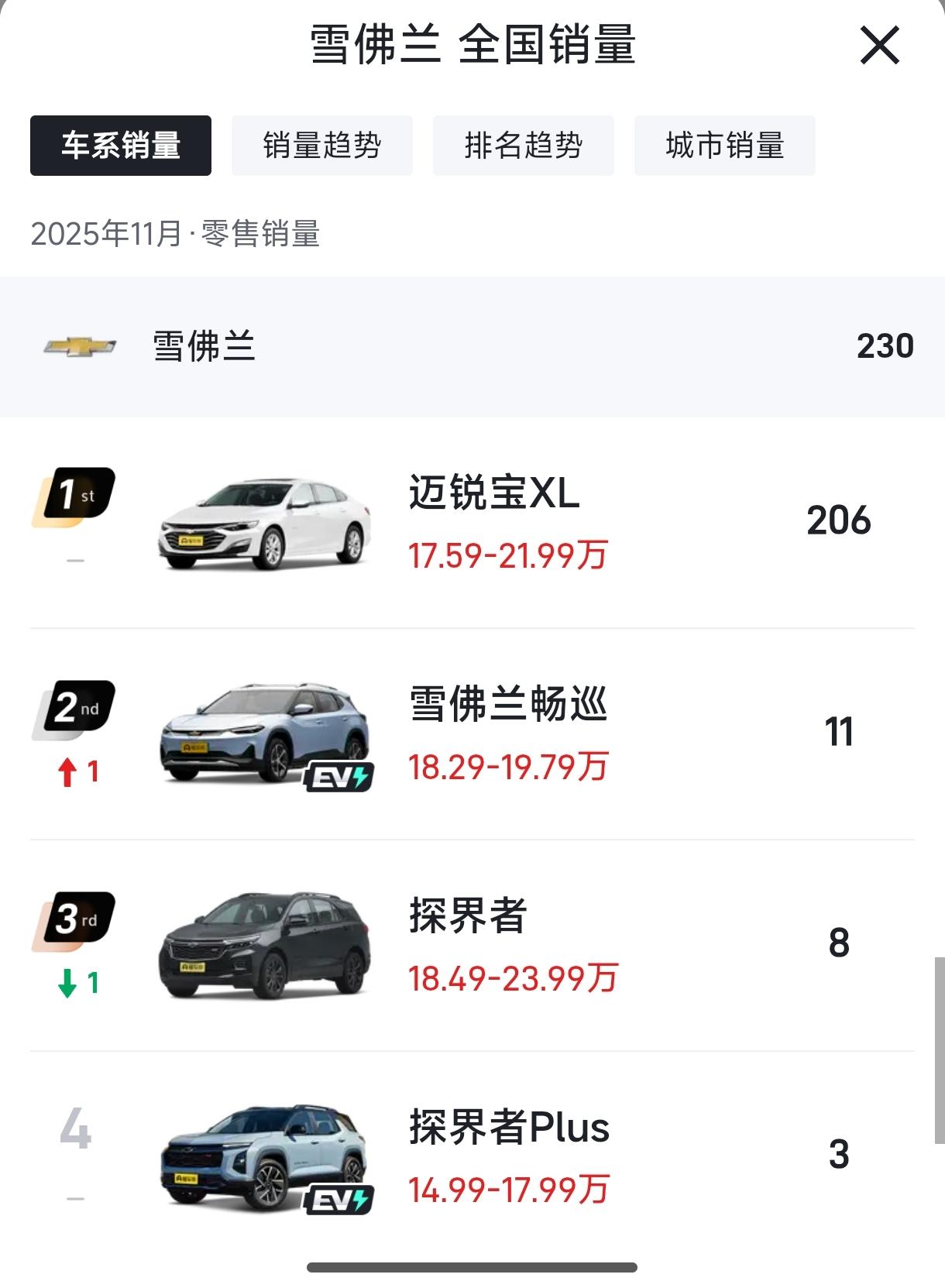天哪,雪佛兰整个品牌,11月份只卖了230辆。 迈锐宝XL卖了206辆,其他车型的销量都可以忽略不计了,曾经热销的科鲁泽、开拓者、创酷,销量都已经归零了。 雪佛兰品牌,辉煌的时候,在中国一年卖了76.7辆,比绝大部分自主品牌销量都要好。 赛欧、科鲁泽、迈锐宝、探界者,都曾经创造过奇迹,风头无两,现在都成了回忆。 国产新能源的崛起,没想到受伤最深的居然是雪佛兰,让人唏嘘。