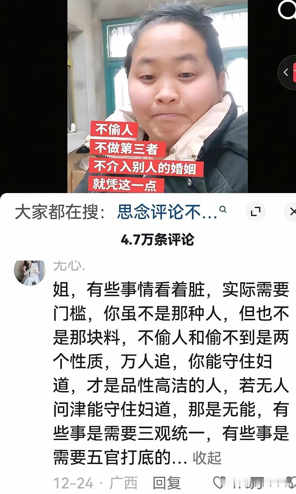 陕西一位网友的视频在网上炸开了锅。 视频里她晒出自己的婚姻日常,言语里满是对自己坚守底线的笃定。她坦言不偷人、不做第三者、不介入别人的婚姻,觉得这是值得骄傲的品性。这段简单的分享,意外勾起了全网的讨论欲。 一条河南网友“思念”的评论,被网友们戏称“年度最杀人诛心”。 评论的文字像一把锋利的刀,直戳人心。它暗指这位陕西网友守住妇道,或许和品性无关,而是长相不够出众。短短几句话,瞬间点燃了评论区的火药桶。有人拍案叫绝,有人怒骂刻薄,两种声音在评论区激烈碰撞。 “思念”的评论写得直白又扎心。 “有些事情看着脏,实际需要门槛。你虽不是那种人,但也不是那块料。” 这句话撕开了成年人世界的一层伪装。“不偷人和偷不到是两回事,万人追你能守住妇道,才是品性高洁;若无人问津能守住妇道,那是无能。” 观点大胆到让人咋舌。“有些事需要三观统一,有些事需要五官打底”,更是成了被反复引用的金句。网友们看完集体沉默,接着便是铺天盖地的自我调侃。有人说突然懂了自己的“安分守己”,原来是五官拖了后腿。有人直言这话难听,却像一盆冷水浇醒了沉浸在自我感动里的人,道破了婚姻里不愿承认的现实。 婚姻里的长相和品性,一直以来都是绕不开的话题。 长相是直观的敲门砖。初见时的眼缘,大多始于五官的吸引。就像之前陕西32岁女子嫁给48岁大叔的婚礼视频,网友们最先热议的就是两人外貌和年龄的差距。有人觉得不般配,有人好奇新娘图什么。长相带来的初始好感,确实能让两个人更快走近。 品性才是婚姻的压舱石。《2024年中国青年婚恋观调查报告》显示,78%的受访者把“三观契合”“有责任心”列为择偶首要条件。那些能走过十年二十年的婚姻,靠的从来不是永远不变的颜值。而是生病时的悉心照料,低谷时的彼此支撑,是柴米油盐里的包容与尊重。三观不合的婚姻,哪怕颜值再登对,也会在日复一日的分歧中消耗殆尽。 长相决定了婚姻的起点,品性却决定了婚姻的长度。 好看的皮囊会随着时间褪色,审美疲劳是必然的结果。而善良、担当、真诚这些品性,会在相处中愈发珍贵。就像有的夫妻,初见时平平无奇,却在岁月里越靠越近,靠的是遇事不逃避的担当,是换位思考的包容,是三观契合的默契。 “思念”的评论或许极端,却意外撕开了婚恋观的讨论缺口。 它让更多人停下脚步,重新审视自己的择偶标准。不再单纯迷恋皮囊的光鲜,也不再盲目标榜品性的高尚。大家开始明白,好的婚姻既需要五官带来的初始吸引,更需要三观支撑的长久陪伴。长相是加分项,品性才是必选项。