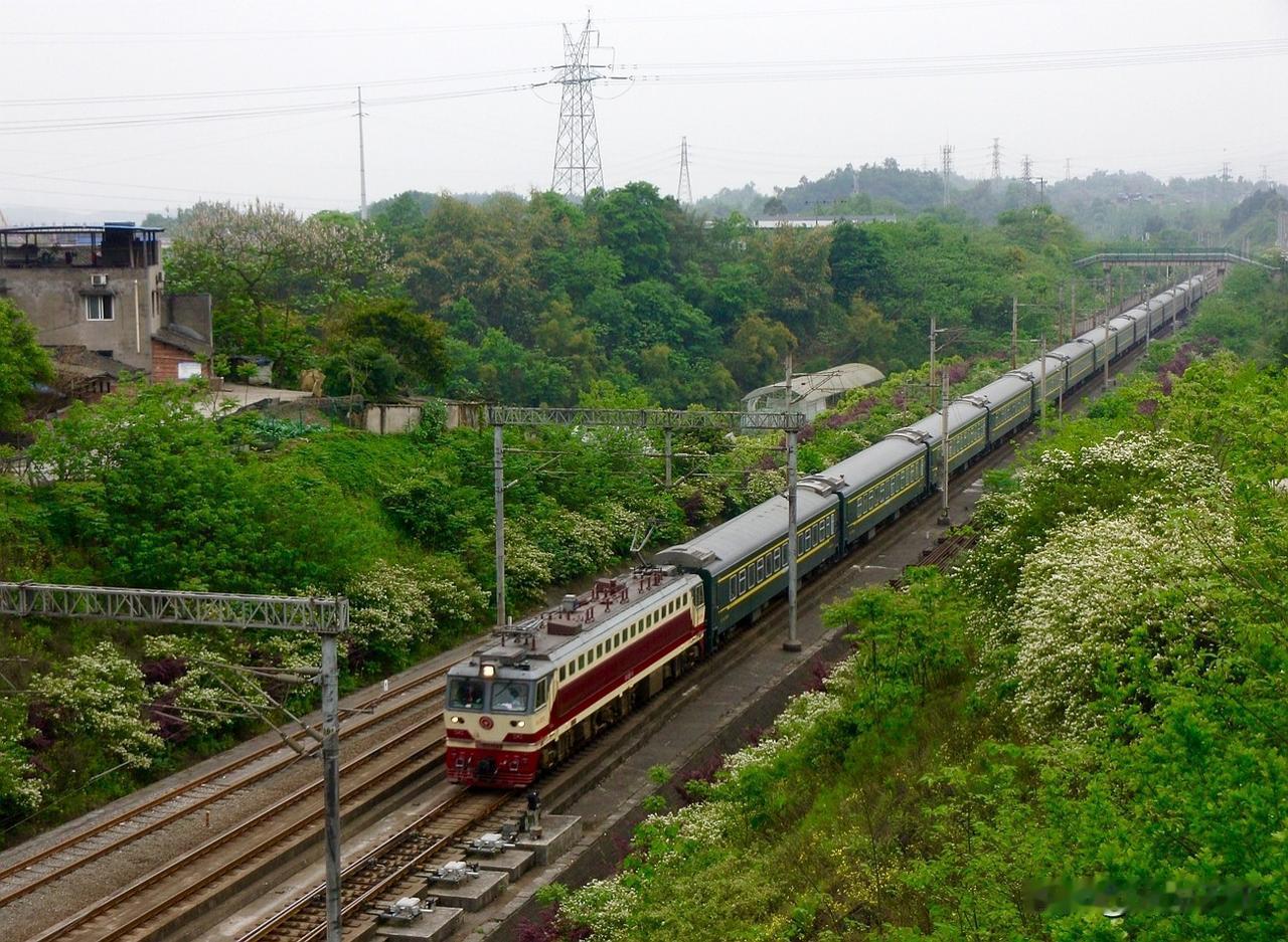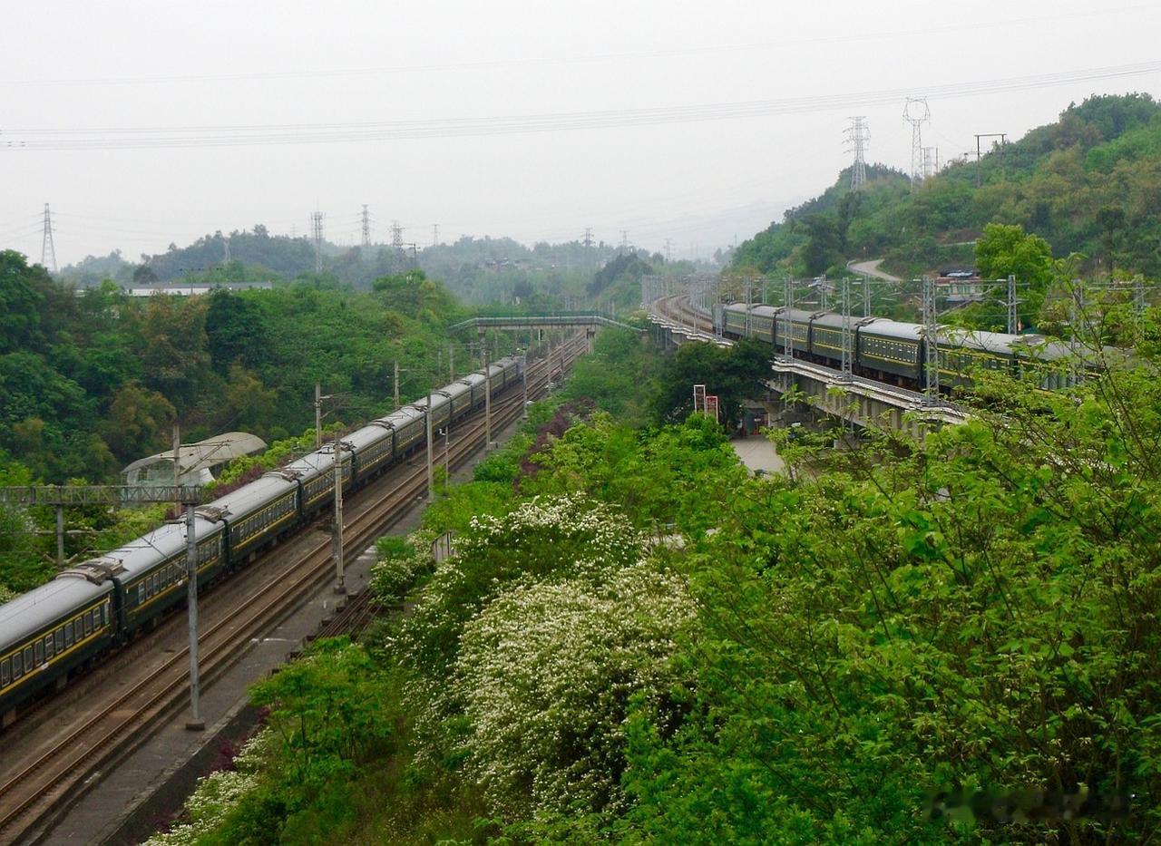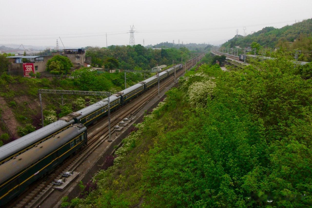 2017年4月在三溪口拍摄的图片,无砟轨道那条线现在叫渭井线,过去属于遂渝线的一部分,右边的线路是沪蓉线,当时拍到三趟列车差不多同时经过此处,渭井线上的两趟列车已经忘了车次,沪蓉线那趟是成都东到长沙的K504次,现在成都那边是进成都西。渭井线上的客车当时都是进重庆北站南场,而沪蓉线的客车都是进的重庆北站北场。
