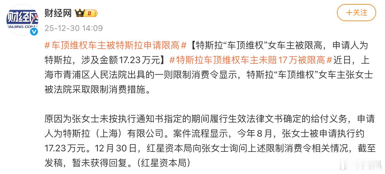 不像几年前,现在关于特斯拉的消息都没什么流量了车顶维权车主被特斯拉申请限高特斯拉车顶维权车主未赔17万被限高特斯拉要求刹车失灵事件女车主赔偿500万