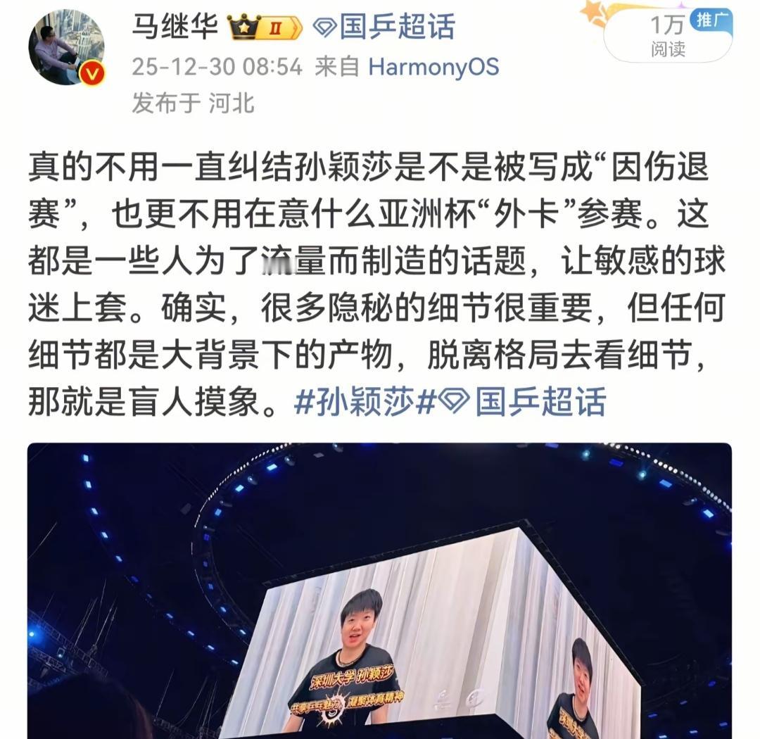 为什么? 有人纠结为什么孙颖莎退赛发出的公告是“退赛”,不是“因伤退赛”? 马继华给出解释。 其实都是一些人为了流量制造的话题,让关注莎莎的敏感球迷上套。大家不要追逐哪些细节,那是大环境大背景下的产物,要学会宏观看问题,不然就是盲人摸象。 莎莎站在那里就是一束光,不管她做任何决定,相信她!