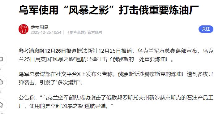 英国惹下大祸?乌克兰在12月25日,使用多枚英国提供的“风暴阴影”巡航导弹,进攻了俄罗斯罗斯托夫新沙赫京斯克炼油厂。 它可是俄罗斯南部前线俄军的“加油站”,专门供应坦克、战机、装甲车要用的柴油和航空煤油,要是核心设备修不好,俄军南部战线的油料供应至少得断好几周。 到时候坦克没油就是一堆废铁,战机没油连起飞都难,前线作战肯定要受大影响。 能打出这种精准打击,核心还是靠英国给的“风暴阴影”导弹。这可不是普通武器,堪称欧洲版“战斧”,是英法联合搞出来的大杀器。 全长5米多,能带450公斤的钻地高爆弹头,普通射程就有250公里,增程型能到400公里,最关键的是它能隐身飞行,普通雷达很难发现。 更厉害的是制导方式,既能靠卫星和惯性导航,末端还能靠红外成像比对目标——发射前把目标照片输进去,到地方自动核对,精准度高得吓人,还不容易被干扰。 这次乌军也玩得挺贼,用了“无人机诱敌+导弹主攻”的套路,先放一堆无人机吸引俄军防空火力,等防空系统忙不过来,再让“风暴阴影”钻了空子,直接命中炼油厂核心区域。 之前俄罗斯就把话放得很明白,只要乌克兰用西方远程导弹袭击俄罗斯本土,肯定会对等反制。 就说2025年1月,因为乌军拿美英导弹炸俄罗斯领土,俄罗斯直接用刚测试的“榛树”新型中程导弹反击。 这导弹速度能到10马赫,现有防空系统都拦不住,直接炸了乌克兰的导弹生产工业区,让乌克兰的能源供应雪上加霜。 这次炸的是这么重要的炼油厂,俄罗斯肯定不会善罢甘休,大概率会加大对乌克兰能源设施和军事枢纽的空袭。 现在正是冬天,乌克兰老百姓本来就不好过,要是再遭遇大规模空袭,停电、停暖都是小事,说不定还会有更多无辜的人伤亡。 更可怕的是,这事儿可能让俄乌冲突彻底失控。 以前两边打仗大多集中在乌东地区,现在英国帮乌克兰把战场延伸到俄罗斯本土的核心设施,其他西方国家会不会跟着学,给乌克兰更多远程武器? 要是那样,冲突就不再是俄乌两国的事儿了,很可能变成俄罗斯和西方的直接对抗,后果根本不堪设想。 而且现在正是乌美谈判停火的敏感时候,乌克兰用英国导弹搞这么大的袭击,直接把谈判的大门关上了,和平的希望变得更渺茫了。 说来说去,英国这次的责任跑不了。它提供的“风暴阴影”导弹,不光让俄罗斯的能源设施遭了重创,经济和军事都受了大损失,还彻底激化了矛盾,让俄乌冲突朝着更危险的方向走。 不管从道义上还是实际后果上,英国都脱不了干系。最可怜的还是普通老百姓,不管是俄罗斯还是乌克兰的民众,都要承受冲突升级带来的痛苦。 真心希望英国能赶紧清醒过来,别再给乌克兰提供武器火上浇油了,不然最后不光害了俄乌两国的人民,说不定自己也会被拖进战争的泥潭里,到时候想后悔都来不及了。 毕竟和平才是最金贵的,再多的政治算计,也不能拿老百姓的性命当筹码啊。