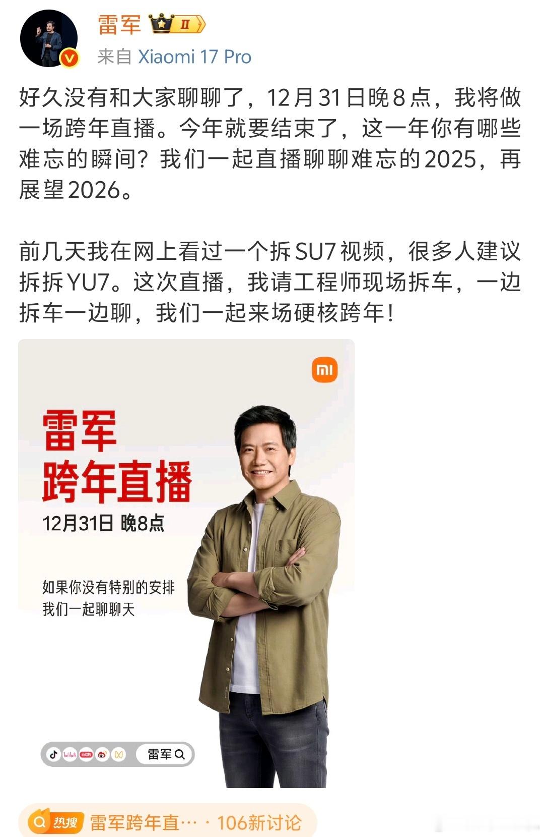 雷军跨年直播拆车我米拆车的热度居高不下,从易车、老章、5号车库等第三方拆车,到雷总亲自在跨年夜直播拆车,也是从多角度展现出极致的技术透明,让人非常期待。不过面对舆论质疑,我米也是不回避,不躲闪,选择最直接有效的方式就是拆车回应,第三方拆车结论出奇一致,均肯定汽车很顶,可即便如此,仍有人带节奏称不敢让人看之类的恶语,于是雷总干脆亲自直播拆车。其实拆解的是产品,更是试图重建沟通的确定性,这种较真和坦诚在汽车行业极为少见,与一些品牌对产品遮遮掩掩形成鲜明反差,我觉得此举并非营销,而是揭行业底裤,展示自身实力与自信。如今,大家对YU7能否扛住拆车直播监督充满期待,而雷总也开启的拆车正传,无疑向用户展示了什么叫口碑之下,名副其实,也让人好奇下一个直播拆车的会是谁,到时候直播间见!