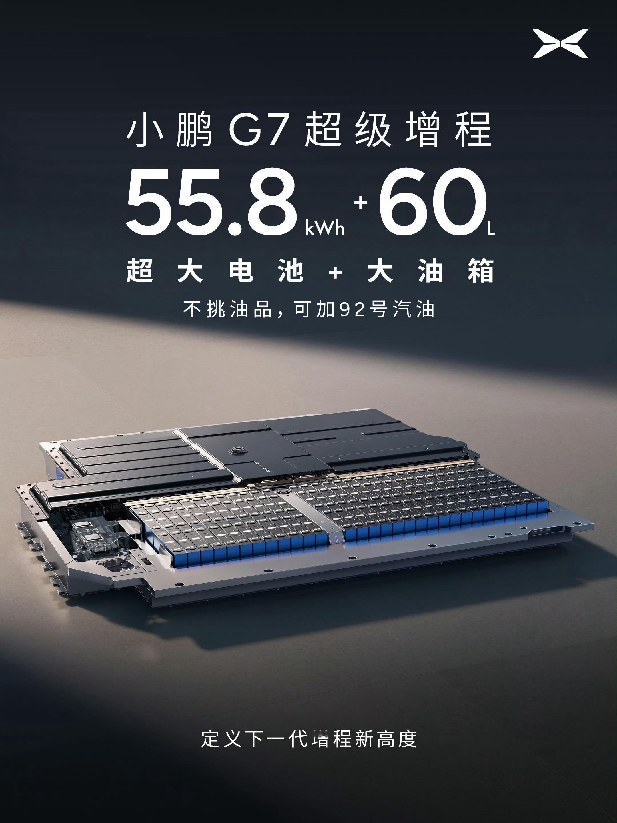 小鹏G7增程版也官宣了800V+5C超充,55.8 度电池+60L油箱综合续航1704公里,纯电续航430公里