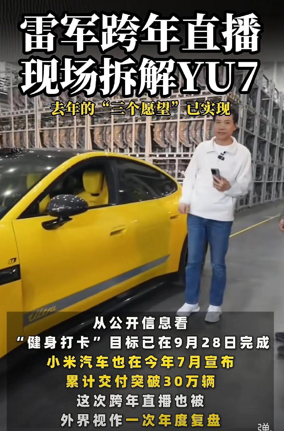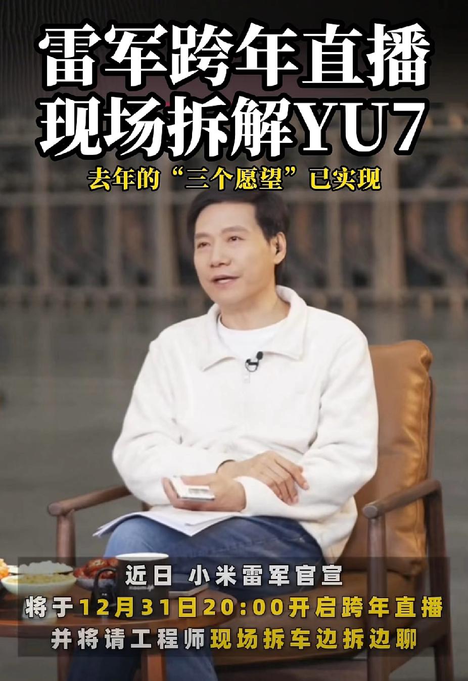 天呐,这雷总真是个“狠人”…… 跨年不整点歌舞升平, 竟然要在直播间里拆小米YU7! 这脑洞,我真是给他跪了! 这雷总是不是“傻”?哪有卖东西的这么卖的?别家车企恨不得把车包得跟粽子似的,说这是核心技术,那是商业机密,神神秘秘的。他倒好,直接把底裤都给你扒干净了。 他这不是在拆车,他是在拿把刀,把那些怀疑他的人的嘴给堵上。 我琢磨着,这得是多大的心,才能干出这事儿?这说明啥?说明这车造得硬气!要是里头偷工减料了,要是钢板薄得跟纸似的,他敢拆吗?他早就躲一边去了。 只有那实打实的硬货,才敢这么折腾。这就叫“身正不怕影子斜”,你爱看啥看啥,爱问啥问啥,反正我这车撞不烂,压不扁。 但这事儿,也真够悬的。这要是拆着拆着,哪个螺丝拧不下来,或者哪个零件掉链子,那就尴尬了。雷总,真是拿命在赌啊!不过,就冲这份狠劲儿,这份敞亮,这车,我有点想看看了。 明晚八点,我也去瞅瞅,看看雷总到底能拆出个啥名堂!