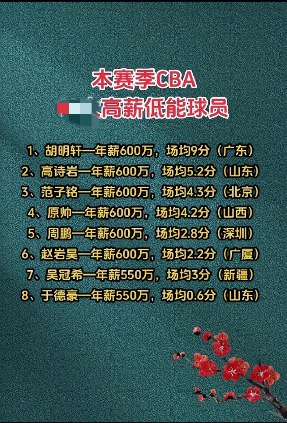 有网友用心统计了CBA联赛八大高薪球员,都能场均得0.6分以上,太厉害了。 这八大高薪球员分别是: 胡明轩,年薪600万,场均9分。 高诗岩,年薪600万,场均5.2分。 范子铭,年薪600万,场均4.3分。 原帅,年薪600万,场均4.2分。 周鹏,年薪600万,场均2.8分。 赵岩昊,年薪600万,场场2.2分。 吴冠希,年薪550万,场均3分。 于德豪,年薪550万,场均0.6分。 八人中,山东男篮占据两席。我靠!
