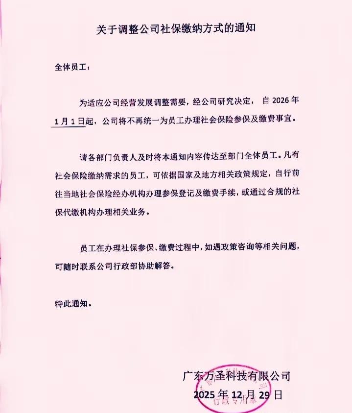 广东梅州这公司胆子也太肥了! 公然发通知说2026年起不给员工缴社保,让大家自己去办,这 哪是经营调整,分明是挑战法律底线! 《社会保险法》写得明明白白,给员工缴社保是用人单位的法定义务,不带半点商量的余地。公司一句“经营需要”就想甩锅,殊不知这种操作不仅要被罚款,还可能被列入失信黑名单,员工更能直接解除合同要经济补偿。 职场不是单方面的压榨,员工拿劳动力换报酬和保障,社保就是最基本的安全感。企业再难也不能拿员工的晚年、医疗保障开刀,这种短视操作只会把人才逼走,最后砸了自己的招牌。 遇到这种违法操作,妥协就是纵容。你觉得员工该直接投诉维权,还是先和公司协商?