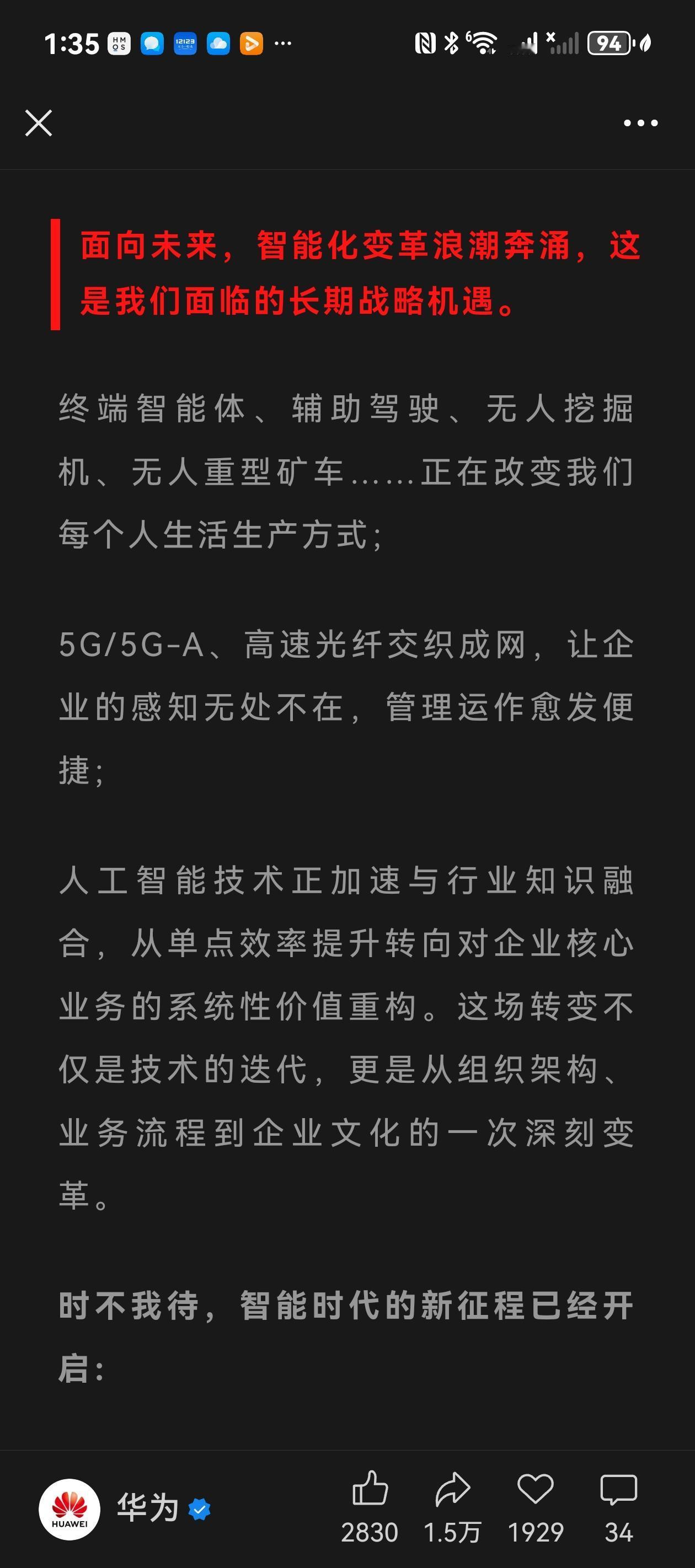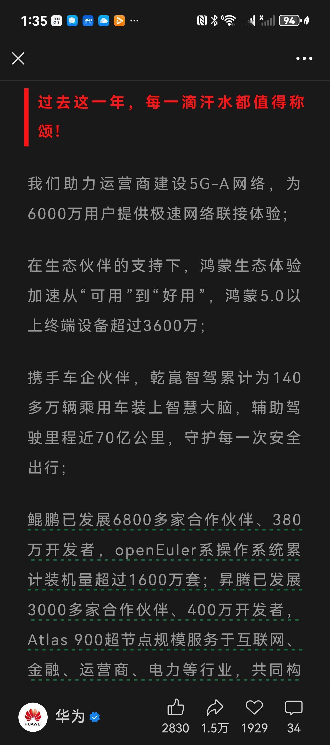 华为轮值董事长孟晚舟的新年致辞,摘选几个跟汽车有关的信息,华为乾崑智驾累计140万辆乘用车,辅助驾驶里程近70亿公里。明年,华为会继续在终端智能体、辅助驾驶、无人挖掘机、无人重型矿车等更多领域投入。总结:孟晚舟点明华为智变方向【来自懂车帝车友圈】