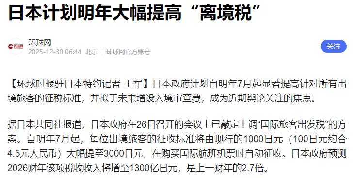 12月30日,日本政府宣布从明年7月起,所有坐飞机或轮船离开日本的人,都要多交一笔钱,这叫“离境税”。且无论是日本本国人还是外国游客,都要缴纳的“离境税”将直接涨价三倍,从原来的一千日元飙升至三千日元。 更让人难以接受的是,从2026年1月开始,去日本旅游、探亲、出差办理单次入境签证的费用,涨幅比离境税还要猛烈,直接从三千日元跳到一万五千日元,足足涨了五倍之多,这也是日本自1978年有相关记录以来首次提高签证费用。 临近年末,日本政府抛出这样两记“涨价重拳”,无疑给本就盘算着赴日行程的人们泼了一盆冷水,这般不顾民众感受的决策,实在让人费解。 高市早苗政府这番大刀阔斧的涨价操作,核心原因就是国内经济问题已经到了难以收拾的地步,只能靠增加税费来“开源”,而外国游客自然成了他们重点瞄准的对象。 自从高市早苗上台执政后,日本的经济状况就每况愈下,为了提振经济推出的扩张性财政政策不仅没起到效果,反而让金融市场剧烈波动,国债收益率飙升到二十多年来的高点,日元持续贬值,通胀问题也愈发不可控。 更关键的是,日本政府的总债务已经超过GDP的230%,在发达国家里都是最高的一档,财政压力早已捉襟见肘。 在诸多经济刺激手段失灵的情况下,他们没有想着从根本上优化经济结构、改善营商环境,反而把主意打到了入境和离境人员身上,试图通过拉高这些基础成本来填补财政窟窿,这种饮鸩止渴的做法,实在算不得明智。 或许日本政府还打着“应对过度旅游”的旗号来为涨价找借口,声称新增的税收会用于旅游相关的配套措施,但稍有常识的人都能看清,这不过是掩人耳目的托词。 后疫情时代全球旅游业都在逐步复苏,日本旅游业虽然也在回暖,但根基本就十分脆弱,完全经不起这样的打击。 此前日本单次入境签证费仅三百多日元,远低于欧美多国,这也是吸引外国游客的重要优势之一,而如今一下子将费用提高到原来的五倍,直接抹去了这一优势。 对于普通游客来说,出行成本的大幅增加会直接影响决策,原本计划好的赴日行程很可能会就此搁置;而对于经常往返本国和日本的商务人士和探亲群体而言,这笔额外的开支更是一笔不小的负担。 高市早苗政府大概以为靠提高税费就能快速增加财政收入,据他们预估,离境税上调后,2026财年的离境税收入能达到1300亿日元,是上一年度的2.7倍,签证费上涨也能带来约1200亿日元的财政收入。 但他们显然忽略了一个最基本的逻辑:旅游业的发展离不开充足的游客流量,而游客流量的多少直接和出行成本挂钩。 把入境和离境的门槛抬得这么高,只会让外国游客对日本望而却步,游客数量减少后,不仅旅游业本身会遭受重创,与之相关的餐饮、住宿、购物等行业也会受到连锁影响,最终损失的经济收益恐怕要比新增的税费多得多。 事实上,一个国家要发展旅游业,靠的是优质的服务、独特的文化魅力和合理的出行成本,这些才是吸引游客的核心竞争力。 反观高市早苗政府的做法,完全是本末倒置,在经济困局面前,没有展现出解决问题的诚意和能力,反而选择了最简单粗暴、最损害自身长远利益的方式。 再加上高市早苗此前的错误言论,对于打算赴日的国人来说,接下来不妨重新考量出行计划,毕竟除了日本,还有很多性价比更高、服务更贴心的旅游目的地可供选择。 经济发展从来没有捷径可走,日本这种靠“薅游客羊毛”的方法解决不了根本问题,反而会陷入恶性循环。