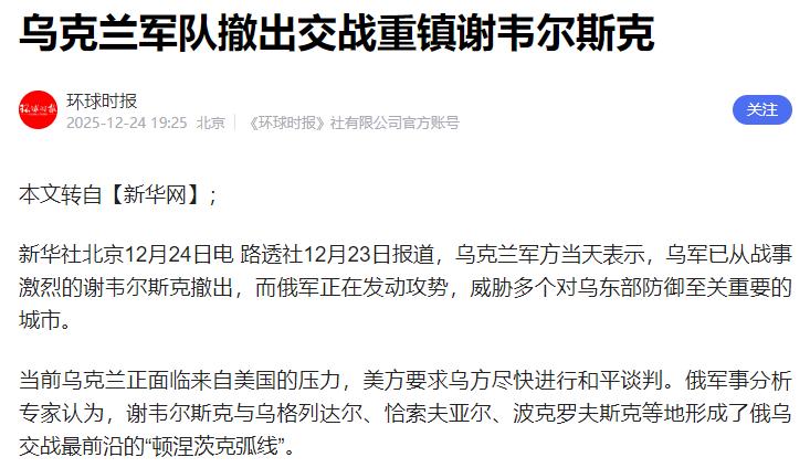 终于,不装了。12天,整整12天,俄军都宣布占领12天了,乌克兰才终于从牙缝里挤出一句:对,我们撤了。 12月11日,俄罗斯方面通过官方渠道正式宣布,俄军已经成功控制了顿巴斯北部的战略要地谢韦尔斯克,还公布了相关视频佐证,消息一出便引发各方关注。 面对这一消息,乌克兰军方的反应却异常坚决,一口咬定俄军是在搞信息战、心理战,直言“谢韦尔斯克仍在我方控制之下”,态度强硬得不容置疑。 可战场的现实从不会因为口头否认而改变,在接下来的12天里,前线的战况并没有朝着乌军宣称的方向发展,反而不断传来不利消息。俄军稳扎稳打,持续巩固阵地,还通过小股部队渗透、无人机袭扰配合炮火压制的方式,一步步压缩乌军的活动空间。 乌军这边则陷入了两难境地,兵力不足、武器短缺的问题越来越突出,后勤补给线也屡屡受阻,别说组织有效反击,就连坚守阵地都变得难以为继。 直到12月23日,乌克兰武装部队总参谋部才正式发表声明,承认乌军已经从谢韦尔斯克撤出。声明里解释说,撤军是为了保存有生力量,避免更大的人员伤亡,还强调“已对俄军造成重大损失”。 但明眼人都能看出来,这更像是一种无奈之下的体面说辞。毕竟如果不是被逼到绝境,谁也不会愿意在否认了12天之后,突然改口承认撤退的事实。 谢韦尔斯克这座城镇的战略价值其实远超其规模,它就像乌军顿巴斯防线的一道“门闩”,北接哈尔科夫,南连顿涅茨克核心区,控制着区域内的交通命脉,还是乌军前线后勤补给的重要中转站。 守住这里,就能挡住俄军向斯拉维扬斯克和克拉马托尔斯克推进的脚步,这两座城市可是乌军在乌东最后的核心阵地;而一旦失守,乌军的整个东部防线就会被撕开一个大口子,后续防御压力会陡增。而乌军这12天的拖延,背后藏着的其实是战场的被动和战略的困境。 这几年的战事下来,乌军的精锐部队损耗严重,后续补充的兵员在战斗技能和心理素质上都有差距。西方盟友的援助也越来越跟不上,原本承诺的武器装备要么迟迟不到位,要么数量严重缩水,导致乌军在战场上经常陷入“有兵无弹”的尴尬境地。 就像这次在谢韦尔斯克,乌军就算想守,也没有足够的炮弹和物资支撑,最终只能无奈撤退。 值得注意的是,乌军宣布撤军的消息传来后,那些平时高调力挺乌克兰的英法德等欧洲国家,却集体选择了沉默。这和之前一有战事就立马发声支援的态度形成了鲜明对比,背后其实是欧洲的援乌热情正在消退。 毕竟打了这么久,欧洲的军火库存也快见底了,经济压力也越来越大,民众对继续援乌的支持度也在下降,大家都开始盘算自己的利益,再也不是当初那种无条件支援的状态了。 这场迟来12天的承认,终究是一场难堪的妥协。对乌克兰来说,这不仅是失去了一座战略重镇,更暴露了其在军事和外交上的双重困境。 至于这场战事的后续走向,随着谢韦尔斯克的易手,乌东战场的格局已经发生了变化,接下来的局势只会更加的清晰。