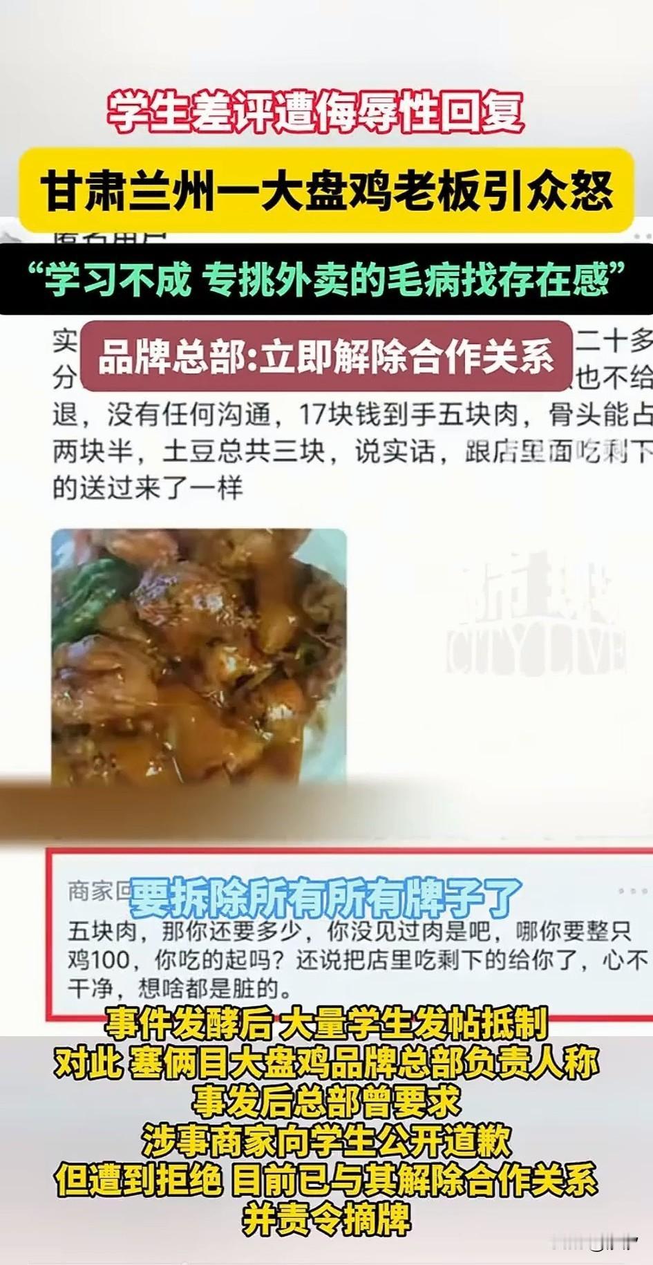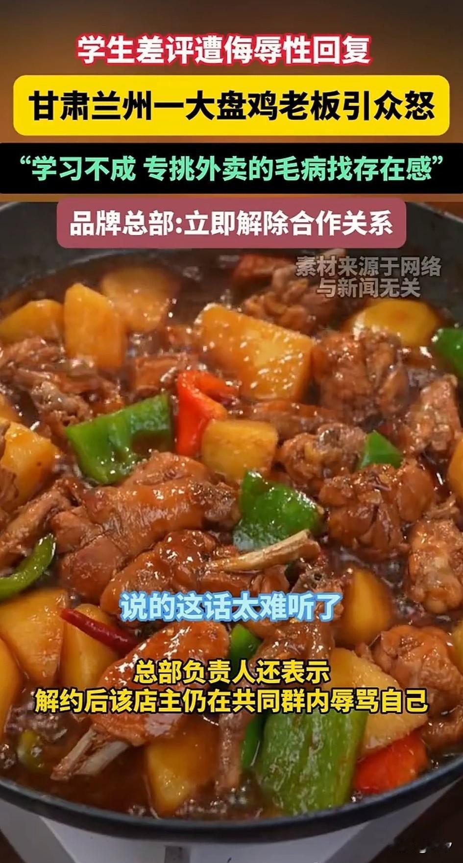 甘肃兰州一大盘鸡店铺老板这事办的不地道,学生群体都敢惹, 大家都知道大学生群体爱说实话, 既然有学生将你家的外卖拍出照片, 给予了差评, 那你就应该虚心接受意见, 立刻改正, 你倒好居然还发出这么恶毒的言论, 这下好了, 遭到学生们集体怒刷差评, 还被人家挂在了网上, 品牌方都怒了, 你这是要砸我牌子呀! 于是总部让老板向学生公开道歉, 这老板也是一根筋, 直接拒绝了总部的要求, 于是总部这才派人来给他解除合同, 以后也不给他提供料包支持, 生意这算是彻底凉凉, 做生意的人都知道变通了, 脸面这东西以后还会有, 只要赚钱无所谓, 没想到这位老板这么刚, 这下好了店铺都开不成了, 大家觉得这是到底是谁的责任? 甘肃身边事 餐饮加盟 餐饮店的那些事 大盘鸡 大盘鸡加盟店 招牌大盘鸡拌面
