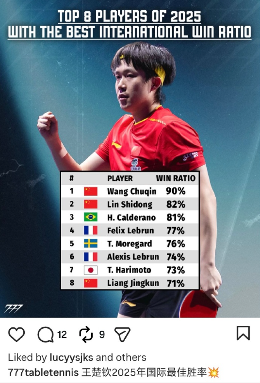 2025年国际胜率最高前8名,王楚钦第一90%,林诗栋排第二82%,梁靖崑排第八