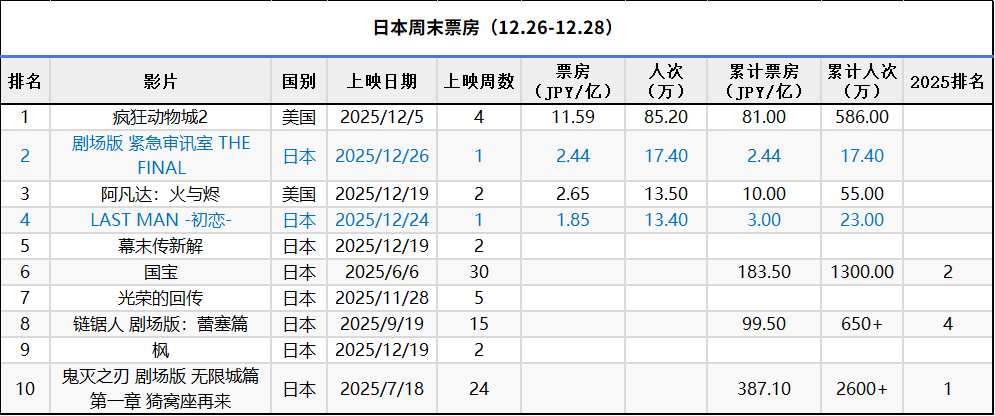 日本周末票房(12.26-12.28):1.《疯狂动物城2》四连冠,累计票房81.2亿日元排名日本影史第87,超越前作的76.3亿;2. 日剧IP《剧场版 紧急审讯室 THE FINAL》在新片中表现最佳;3.《阿凡达3》累计票房仅10亿日元。(数据来源:kogyotsushin、dorama)