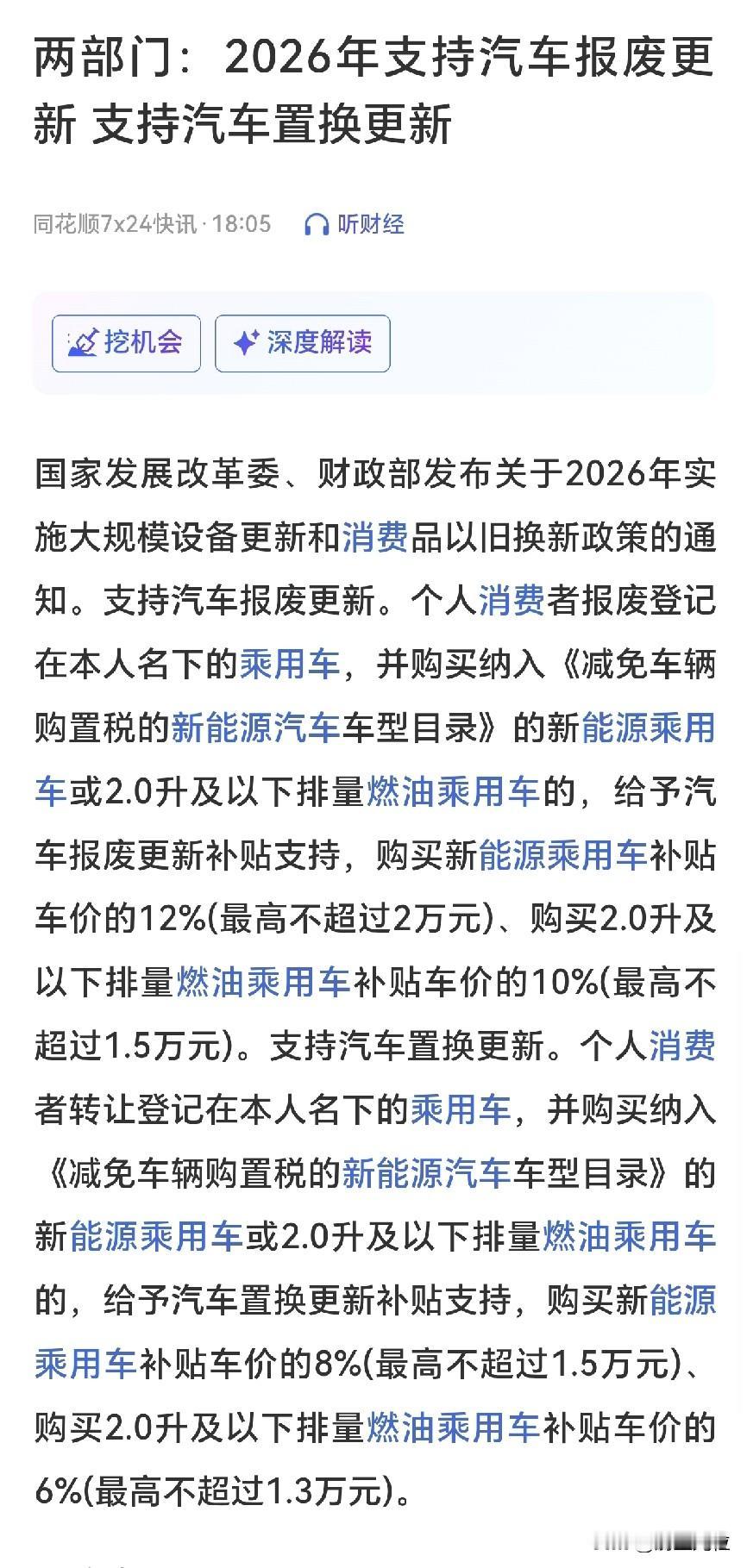 2026年国补发布了,便宜的车天塌了,按比例了,报废补贴还是2万,但是按比例新能源车价12%,燃油车10%,海鸥星愿什么的估计只能拿到几千块的国补了。 新能源置换补贴8%,燃油车6%,最高1.5万。