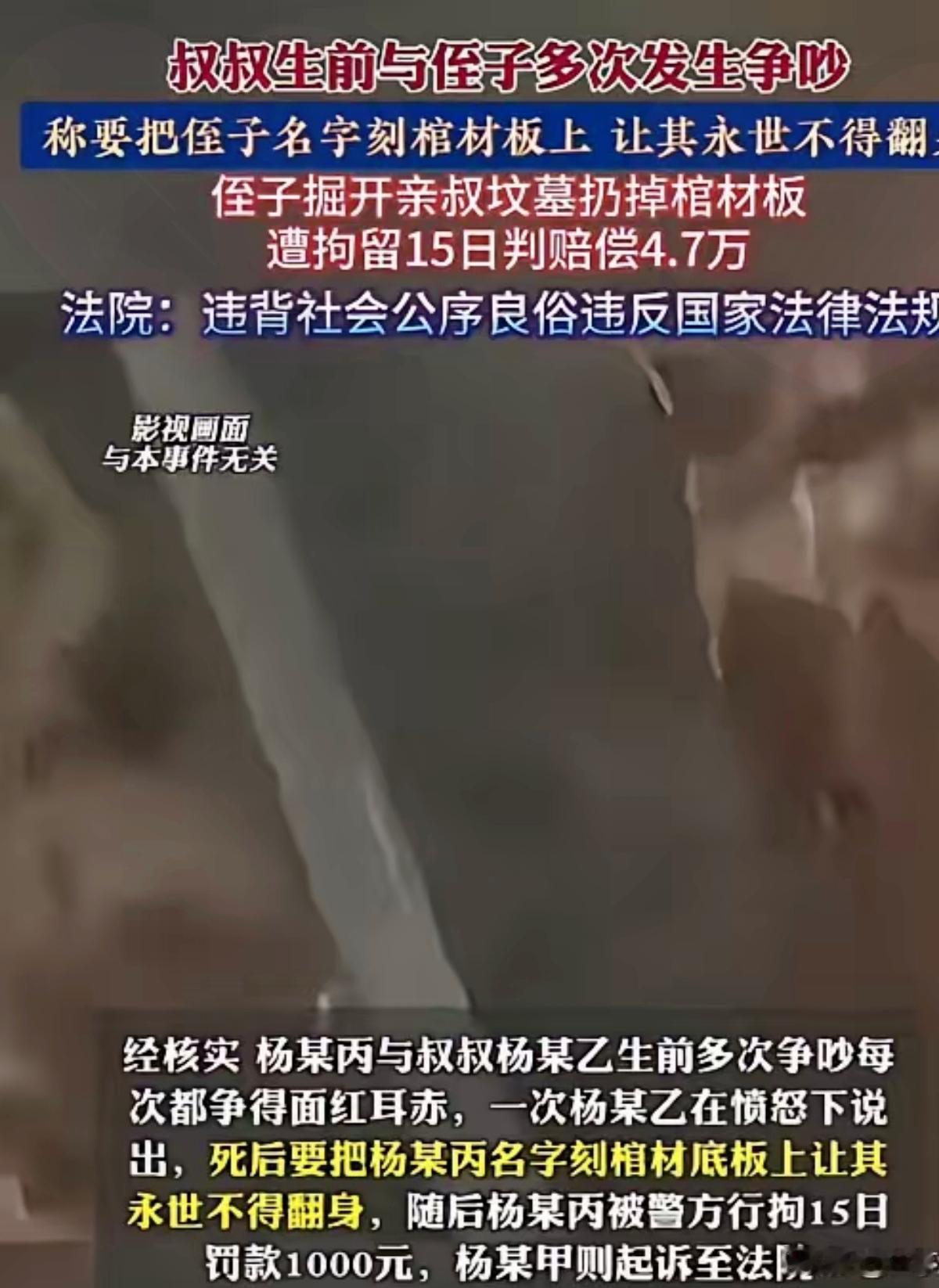 太狠了!四川侄子记恨叔叔生前放狠话,竟趁家人外出挖坟踹棺扔底板,法院判决看着意外实则公道! 叔侄俩因田地浇水拌嘴结仇,叔叔放话死后刻他名字让他翻不了身,这话成了侄子的心魔。叔叔病逝后,侄子遇事不顺就归咎于此,伙同同学深夜挖坟,没找到名字还踹掉棺底板扔河里,自以为天衣无缝还是被发现,先拘15天罚1000。 家属起诉索赔5万,法院没定罪却判赔4.7万,这判决太清醒!没毁遗骨不算刑事,但挖坟践踏的是逝者尊严和生者念想精神赔偿一点不冤。 说到底口舌之争别放绝话,迷信执念更别碰底线,亲情再淡也不能糟践逝者,这不仅是缺德更是违法,一时冲动换来赔钱又丢脸,真不值! 大家觉得这判决够不够解气?换做是你,能放下叔侄间的这点仇怨吗?