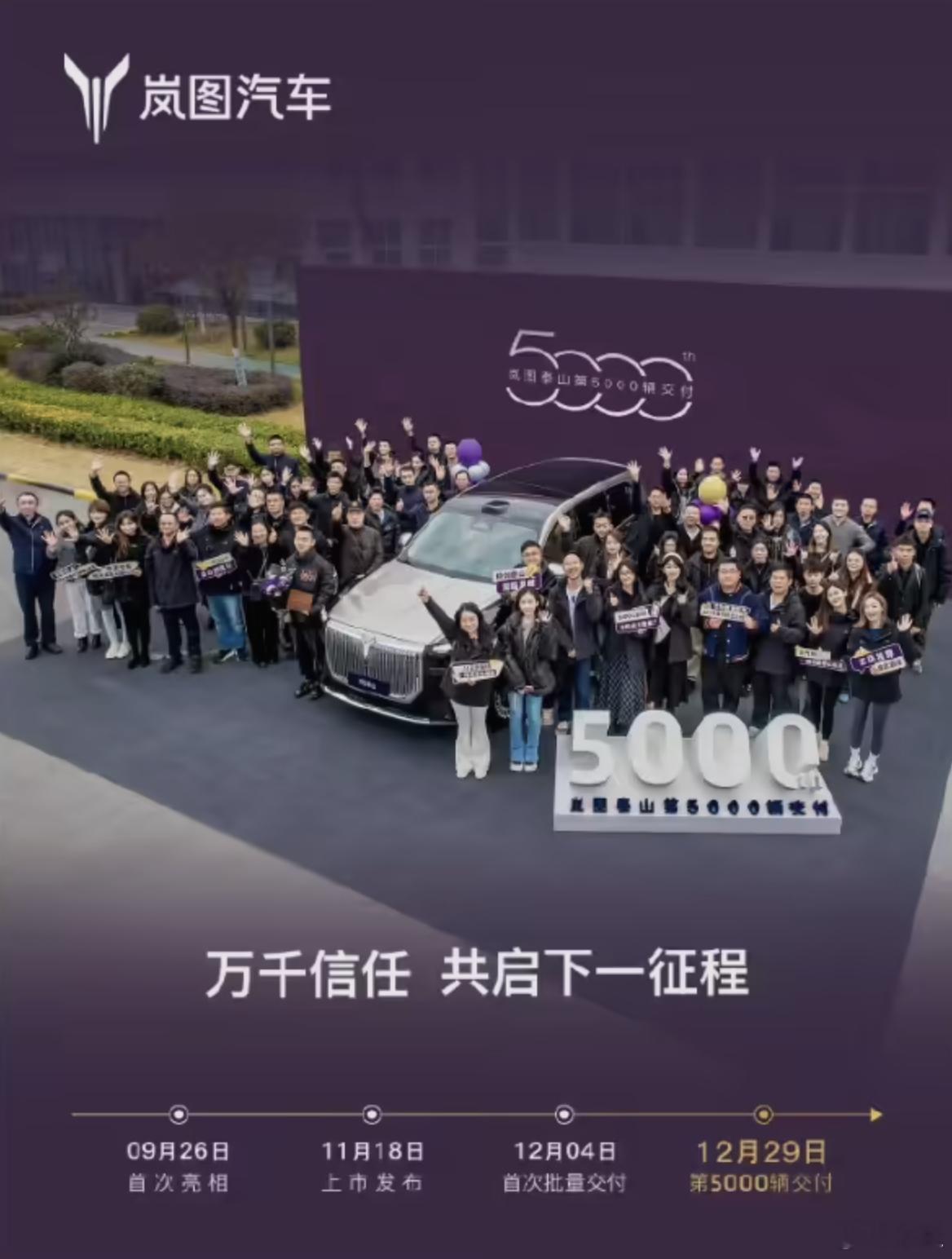 12 月 30 日,岚图汽车正式对外公布,旗下首款搭载三腔空气悬架的华系旗舰 SUV—— 岚图泰山,上市仅 26 天交付量便突破 5000 辆。岚图汽车
