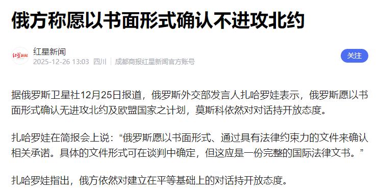 俄罗斯终于让步了!俄罗斯突然甩出一个让全世界都挺意外的重磅提案。俄罗斯外交部发言人扎哈罗娃公开表示,愿意与北约、欧盟签署具有法律效力的“互不侵犯条约”,甚至提出要把这一承诺写入宪法。 谁能想到,和北约硬刚了几十年的俄罗斯,会主动递出这样的橄榄枝,而且还愿意用宪法来背书,可回看历史就会发现,俄罗斯做出这种决策其实并不意外。 这几年俄罗斯面临的压力可不小,持续的冲突让俄罗斯经济承受了巨大负担,2025年俄罗斯GDP预计增长只有1%,和2024年4.3%的增速相比下滑明显。 再加上欧盟一直在加码对俄制裁,累计上千项制裁措施卡住了俄罗斯的能源、金融和科技通道,尽管并未完全被世界孤立,但还是让俄罗斯的经济运转越发吃力。 与此同时,根据俄罗斯12月24日公布的民调数据,三分之二的受访者都支持与乌克兰谈判,这个比例创下了开战以来的新高。虽然还有七成民众对俄军2026年的表现抱有期待,但“盼和平”的意愿已经非常明确。 毕竟战争持续了四年,不管是军人还是普通民众,都已经厌倦了这种长期紧张的状态,民心所向让俄罗斯不得不考虑通过外交途径寻找突破口。 这些年北约一直在不断东扩,成员国从16个增加到32个,边界一步步向俄罗斯推进。 尤其是芬兰2023年加入北约后,俄罗斯和北约的陆地边界多了近1300公里,加里宁格勒飞地被北约三面包围,西部核心工业区还处于北约战术导弹的覆盖范围内,安全空间被挤压得越来越小。 在这样的背景下,俄罗斯抛出这份互不侵犯条约提案可谓得相当精明,看似是让步,实则是“以退为进”。 之前西方一直把俄罗斯塑造成“威胁制造者”,现在俄罗斯主动提出签署互不侵犯条约,就是要向全世界证明自己渴望和平,反过来把“破坏和平”的压力抛给西方。 如果北约和欧盟拒绝,就会让欧洲民众觉得是西方在阻碍和平进程。 更何况,北约内部本来就不是铁板一块,波罗的海那些国家态度强硬,天天喊着要对俄强硬;但德国、匈牙利等国就不一样,德国民众已经上街抗议,要求把钱用在修学校上,而不是买导弹,匈牙利更是直接拒绝参与欧盟给乌克兰的贷款计划。 俄罗斯抛出这份提案,也是想利用这种分歧,分化西方对乌的军事支持。 目前来看,北约和欧盟的态度还比较微妙。北约这边不仅没有松口,反而在加紧备战,刚在爱沙尼亚启动了“刺猬2025”军演,还计划到2035年把成员国的国防支出提高到GDP的5%。 对北约来说,“俄罗斯威胁”是维系联盟凝聚力的关键,要是真签了互不侵犯条约,联盟存在的意义都会打折扣,再加上美国要战略收缩回美洲,这个军事联盟还能存在多久可就不好说了。 欧盟这边则更显尴尬,一边跟着美国对俄实施制裁,另一边自己的能源和供应链还依赖俄罗斯,制裁就像双刃剑,伤俄的同时也在伤害自己。 德国的制造业面临工厂流失的困境,法国、意大利等国的民众也因为通胀压力怨声载道,但在北约规则和美国压力下,欧盟各国又不敢公开表态支持谈判,只能保持沉默。 俄罗斯这份重磅提案不是简单的“服软”,而是一场精心算计的外交博弈。俄罗斯想要的无非是安全空间,北约想要的是联盟凝聚力,欧盟则夹在中间左右为难,各方诉求不同,这份条约能不能签成还是个未知数。 但可以肯定的是,这一提案已经让全球地缘博弈的格局发生了微妙变化。接下来北约和欧盟会如何回应?这场和平试探最终会走向何方?值得所有人关注。