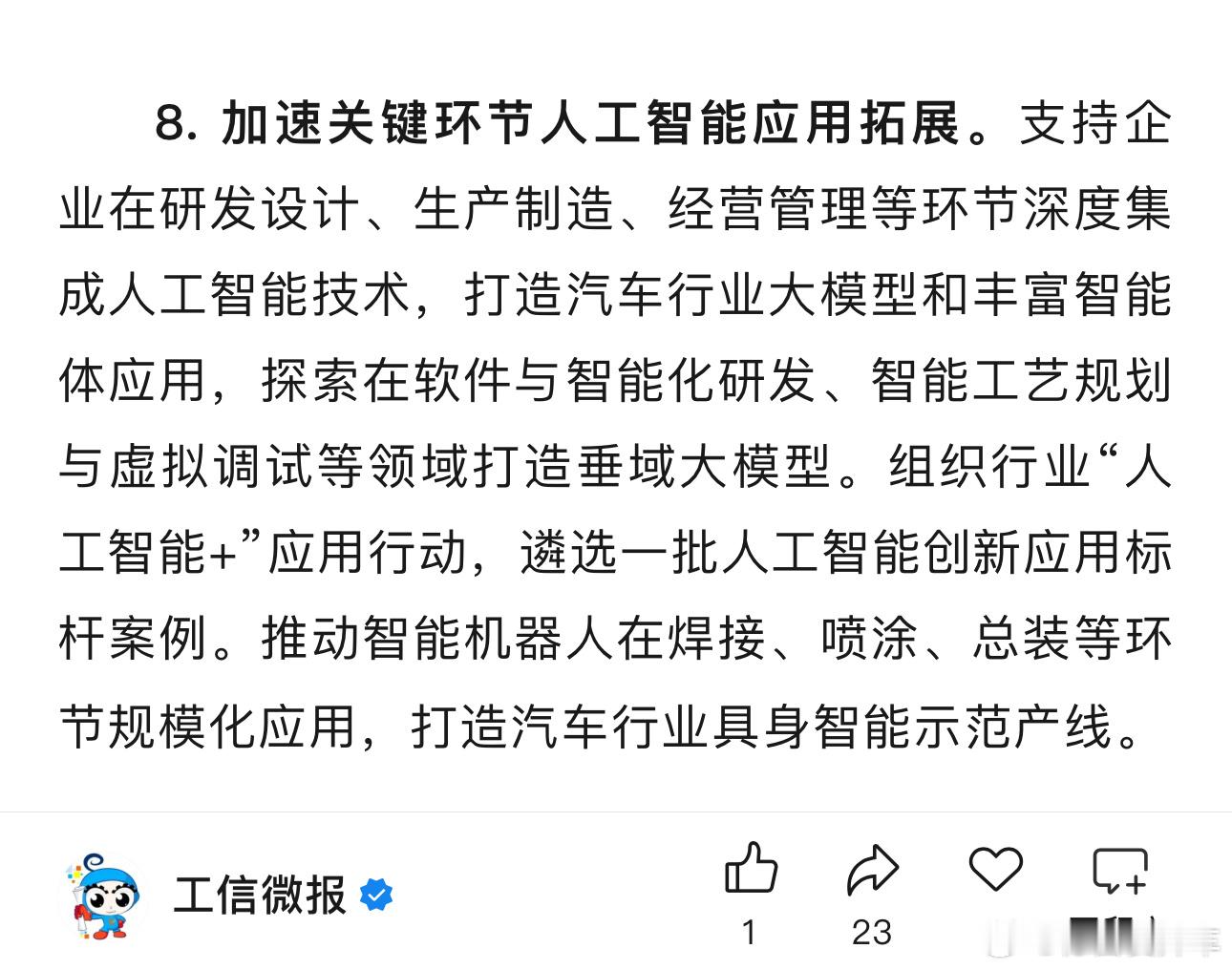 四部门印发关于《汽车行业数字化转型实施方案》的通知,其中包括了这条内容, 「推动智能机器人在焊接、喷涂、总装等环节规模化应用,打造汽车行业具身智能示范产线」。现在来看,已经有不少车企在工厂试点,但是规模化运用还比较远,在想象中机器人可能要代替人类劳动,机器人可以三班倒不休息的工作,但从现在的情况来看还没有发生,原因是成本也很简单,目前人形机器人使用大多比人工来的更高,机器人灵巧手、关节执行器是有一定的损耗和使用寿命,这方面维护成本挺高,所以场景是有了,而产品技术还需要再研发攻克一下这些具体的痛点和场景。