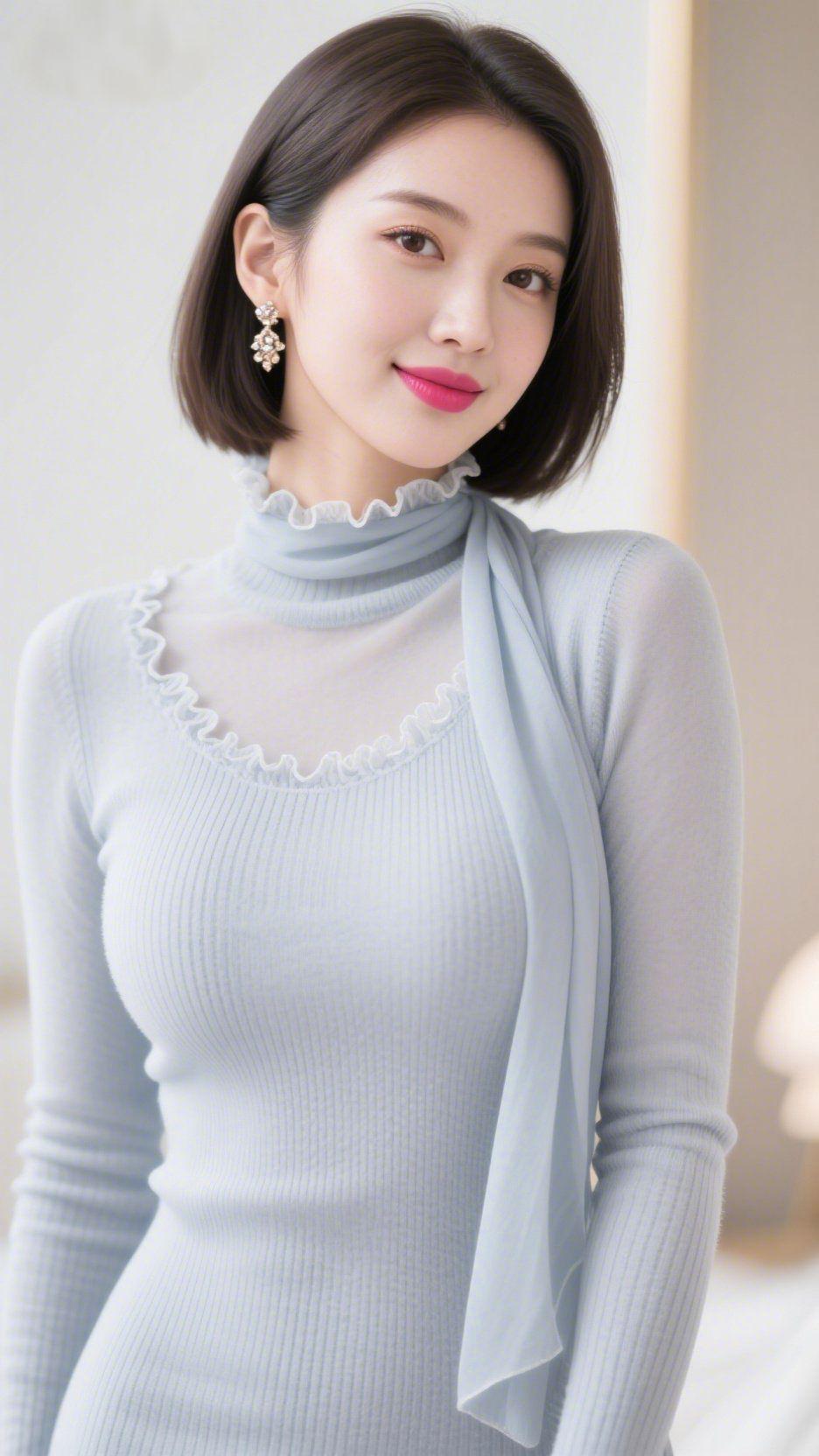 浅雾里的柔蓝衫 暖光裹着软调漫开时,她身上的浅蓝针织衫像浸了层云的轻。领口的蕾丝褶边随呼吸轻晃,丝巾垂落的弧度软得像春日的风,耳坠上的碎钻亮得像檐角沾的星。 唇色是温软的粉,笑意舒展时,连周遭的光都慢了节奏。衣料裹着自然的松弛,每道纹理都浸着安静的温柔——像把晨雾的软,织进了这一身浅蓝里。 原来舒服的美从不是张扬,是这样妥帖的柔,让光都绕着她轻转,落进眼底时,便成了最舒展的暖意。 浅蓝柔雾感 温柔静美