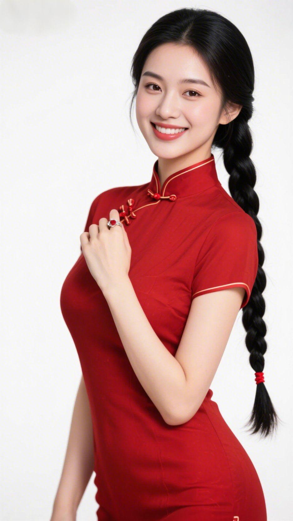 红裳映韵藏风华 一袭正红旗袍衬得气质温婉,金色滚边衬出领口的雅致,盘扣如红珠般点缀,将中式美学的婉约揉进了衣袂间。乌黑的长发编成长辫垂落,红绳束起发梢,与旗袍的艳红相映成趣,添了几分灵动的少女气息。 她回眸浅笑时,唇角的弧度像枝头绽放的红梅,眼眸里盛着澄澈的欢喜,指尖轻触盘扣的瞬间,似将东方的温柔与典雅都凝在了这一帧画面里。素净的背景更衬得红裳明艳,却不张扬,反倒像一杯醇厚的红梅酒,初看惊艳,细品方知藏着中式韵味的悠长。 原来传统服饰的美好,从不是刻板的复古,而是这般与灵动的气质相融,让东方的韵致在眉眼间、衣袂间流转,简单的一个笑,便足以让人心头漾起对中式美学的偏爱。 中式旗袍美学 东方韵味之美