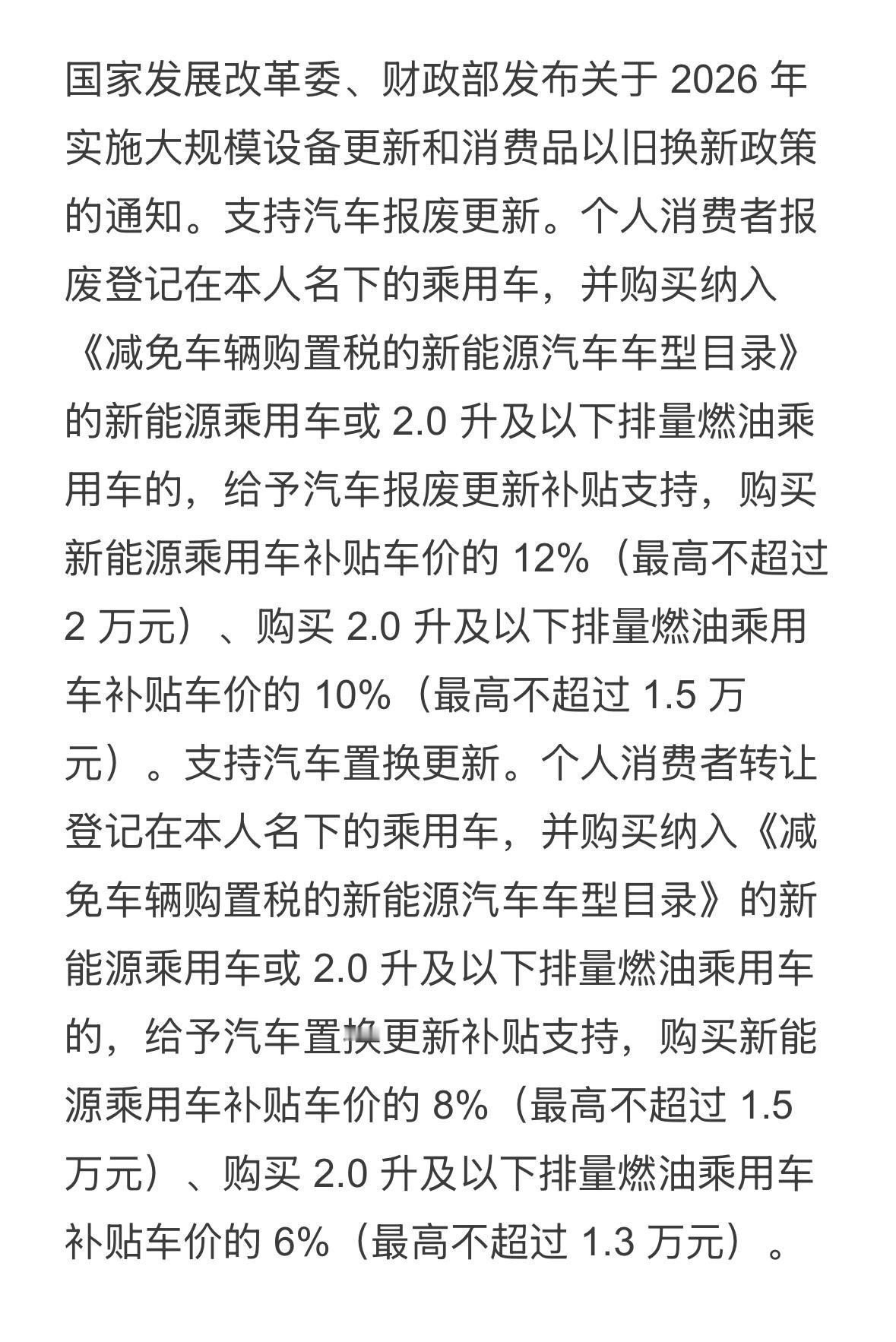 2026年国补具体规则出来了: 买手机和平板等:补15%(500封顶) 买大小家电:补15%(1500封顶) 买新能源乘用车:报废补12%(2万封顶);置换补8%(1.5万封顶)
