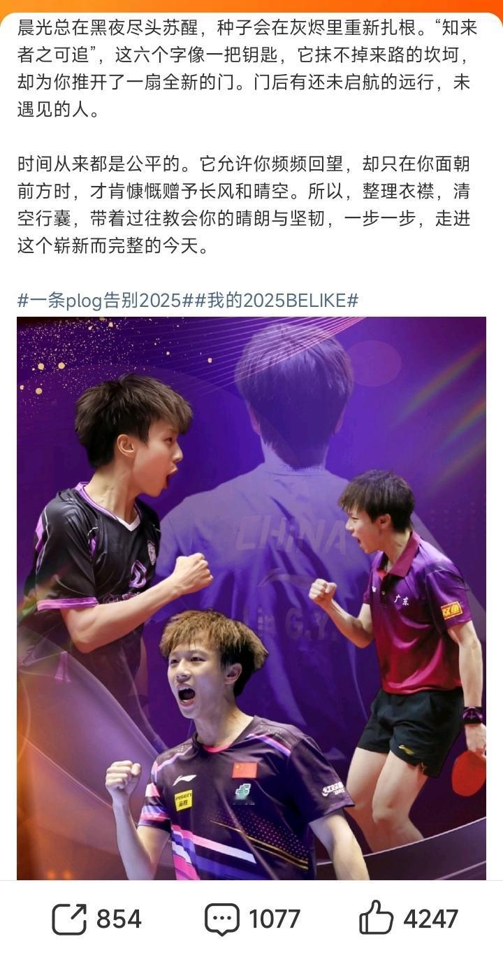 悟已往之不谏,知来者之可追! 刚刚!林高远自媒体发文展望2026[赞]! 高远在2025年全力以赴,在国际赛场,在全运会,在乒超联赛都取得了一定的成绩。 感谢2025全力以赴的林高远,相信过去会成为宝贵的财富,未来也会有更多精彩的故事,祝福林高远在2026,一切顺利,球迷们永远为你呐喊、为你欢呼、为你热泪盈眶! 每一天都有新的太阳,也有一个新的林高远,祝福高远,永远支持你[奋斗]!