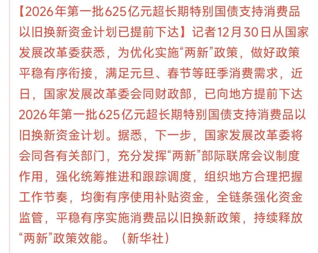 消费板块迎来重大利好,提前下达消费特别国债最新消息:2026年第一批625亿特别国债提前下达了。其实从政策上面也可以看出,最近村里一直在出促进消费的政策,尤其是明年的扩内需已经上升到了战略层次。这次提前下达特别国债就是为了能够刺激消费,能够提前把消费数据提高上去,以达到能循环的作用。这625亿是真金白银的支持消费,实实在在的利好消费板块,这些钱主要就是促进家电,汽车,数码产品为主,对相应的板块也会形成利好。明天消费板块也会受到刺激,至少会有一个冲高的涨幅。